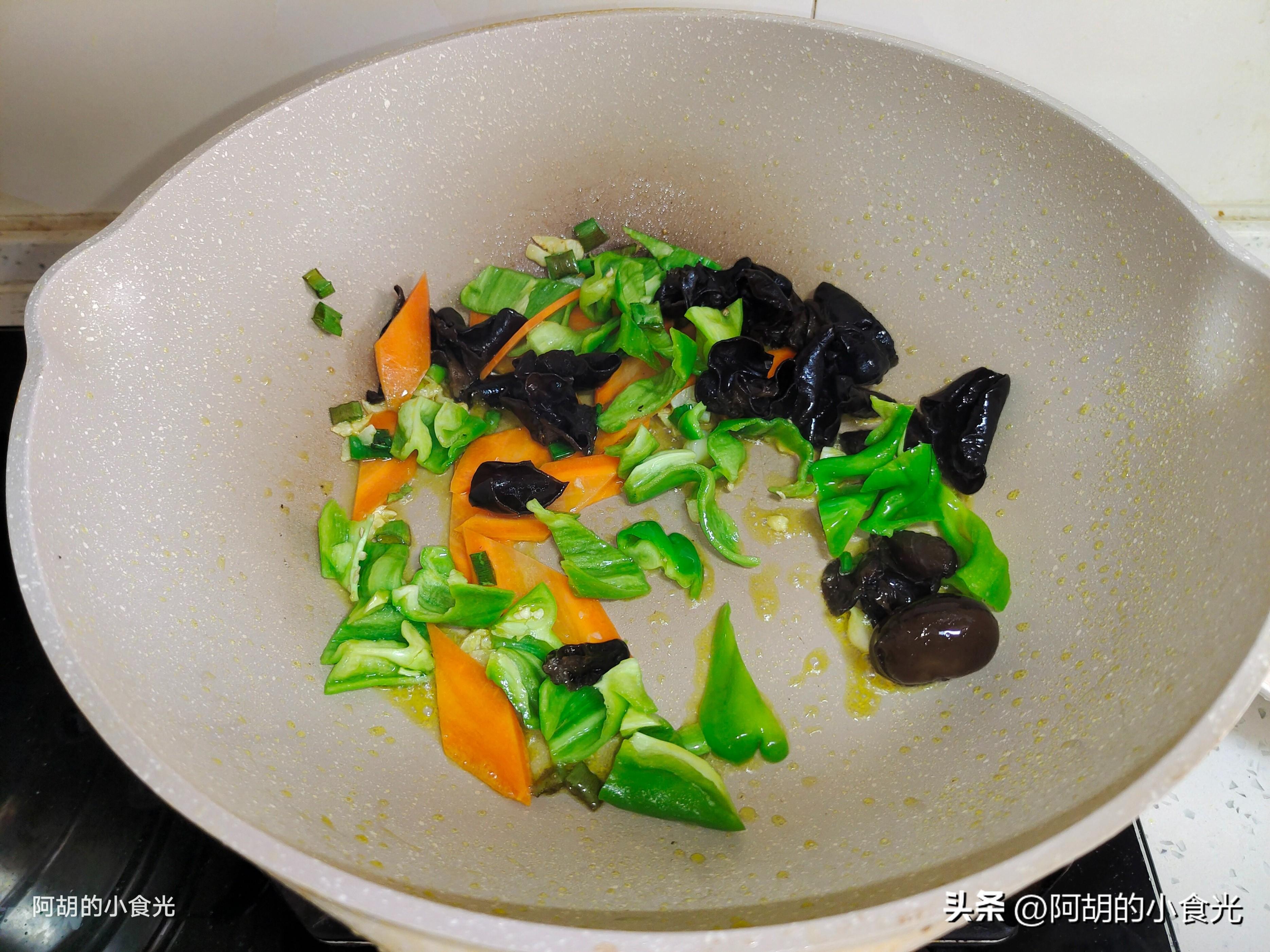 第四步:另起鍋燒熱,淋入一些菜籽油小火燒熱,來一些小料蔥蒜末倒入鍋中炒出香味,接着將所有的配菜胡蘿蔔、木耳和青椒一塊倒入鍋中,轉爲大火快速翻炒,炒出食材的香味。