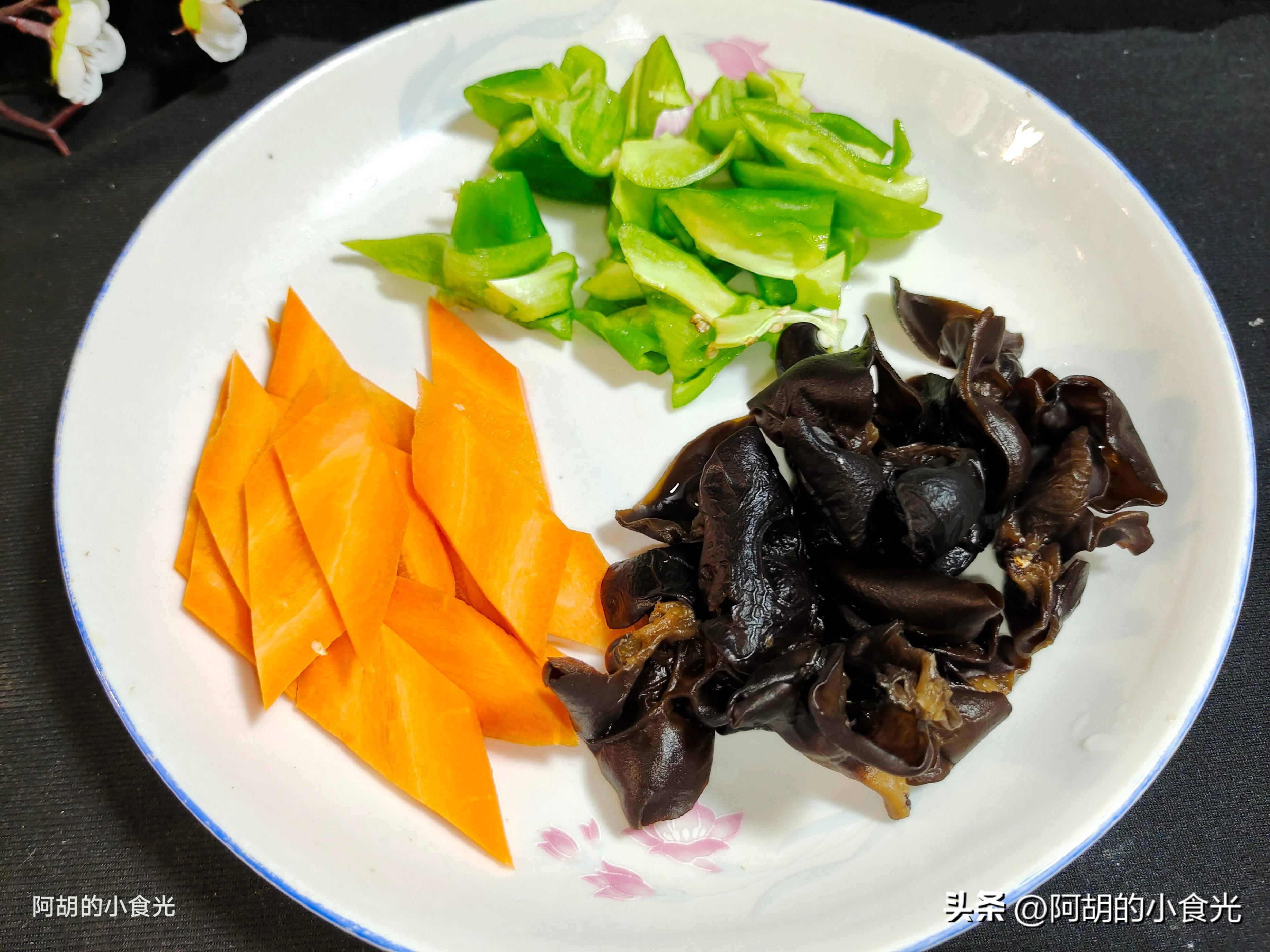 第二步:再來準備一些配菜,有一小塊的胡蘿蔔切開成菱形片待用,少許的幹木耳用涼水充分地泡發備用。還有青椒兩個剖開去籽後切車片備用。
