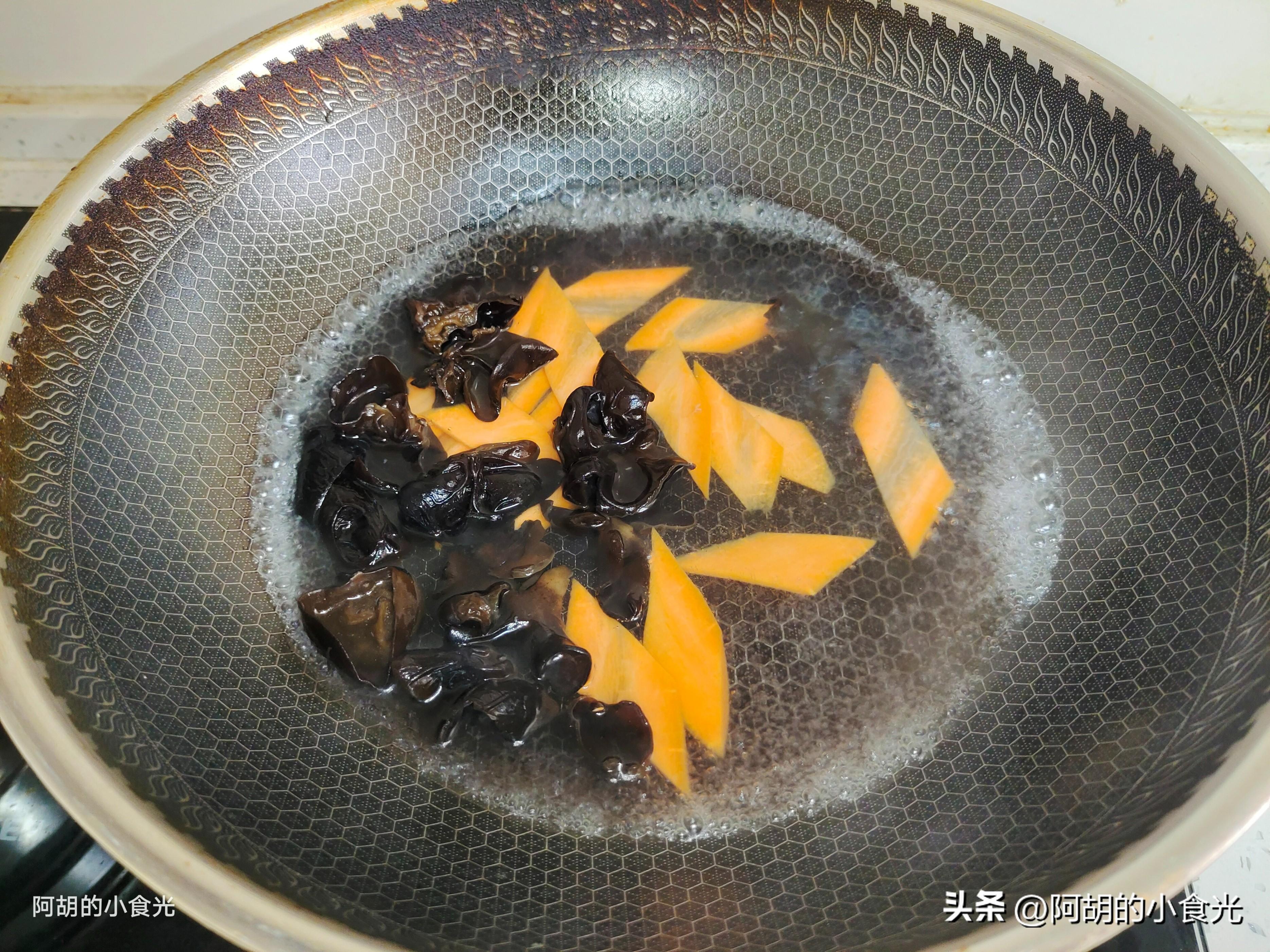 第三步:鍋裏再燒一些開水,保持沸騰後將胡蘿蔔和木耳下鍋焯燙一分鐘,撈出後放一邊瀝乾水分待用。