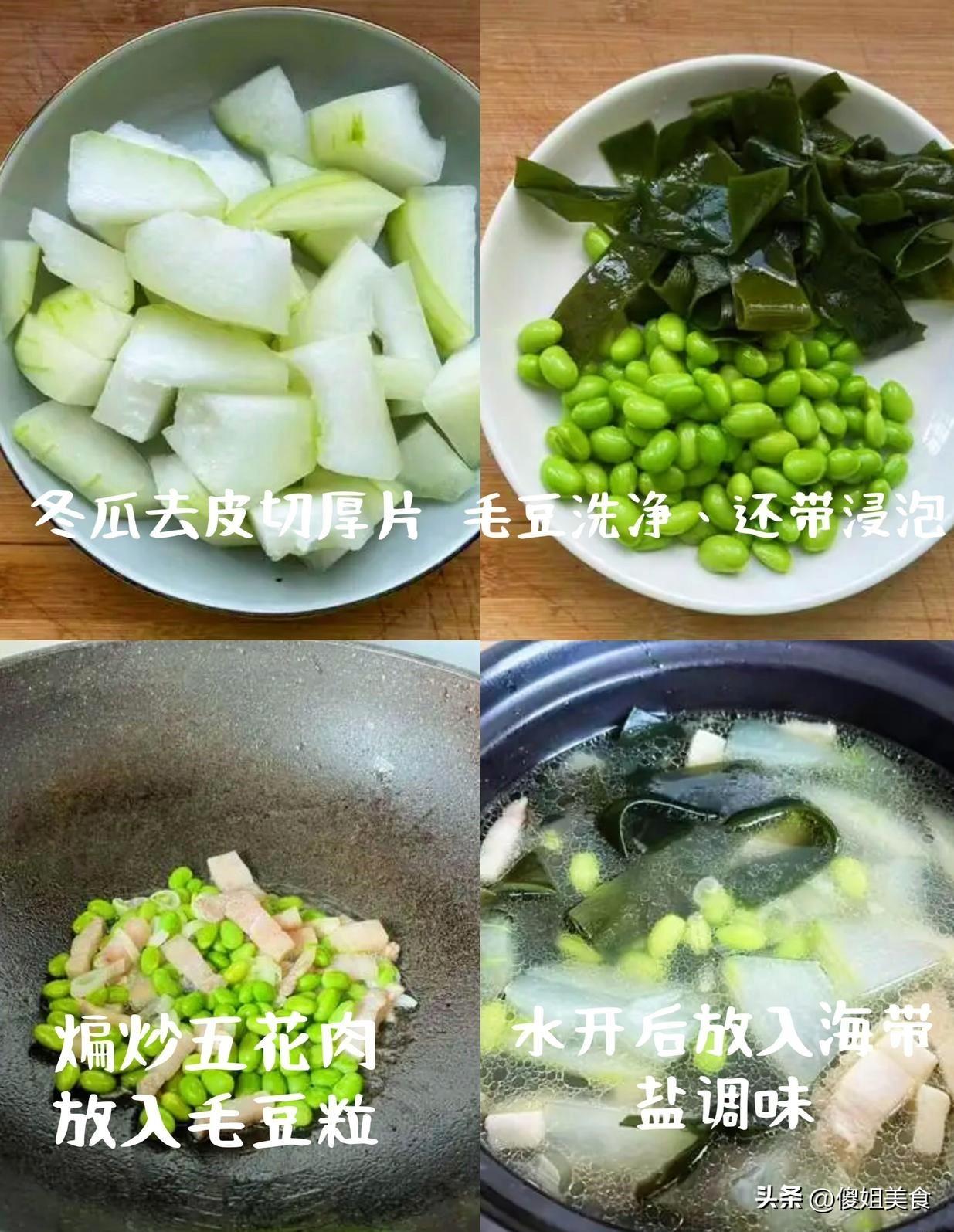 做法:1、冬瓜切厚片(皮留着更營養),毛豆剝好,海帶結洗乾淨。