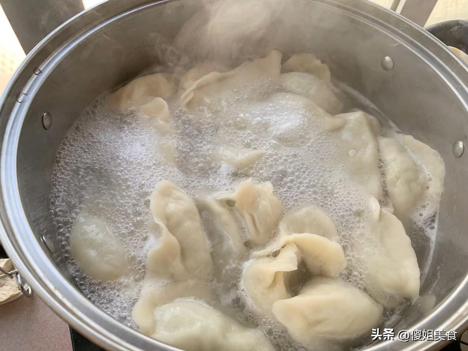 6、大鍋燒水,水開下餃子。用勺子背輕輕推兩下鍋底,別讓餃子粘鍋。蓋上蓋兒,大火煮沸。水滾了,點一小碗涼水進去,壓壓沸。如此反覆點個兩三次水。看着餃子們一個個變得白白胖胖,肚子圓鼓鼓地浮在水面上跳舞,餃子皮變得透亮隱約能看到裏面油潤誘人的餡色,得了!趕緊撈!