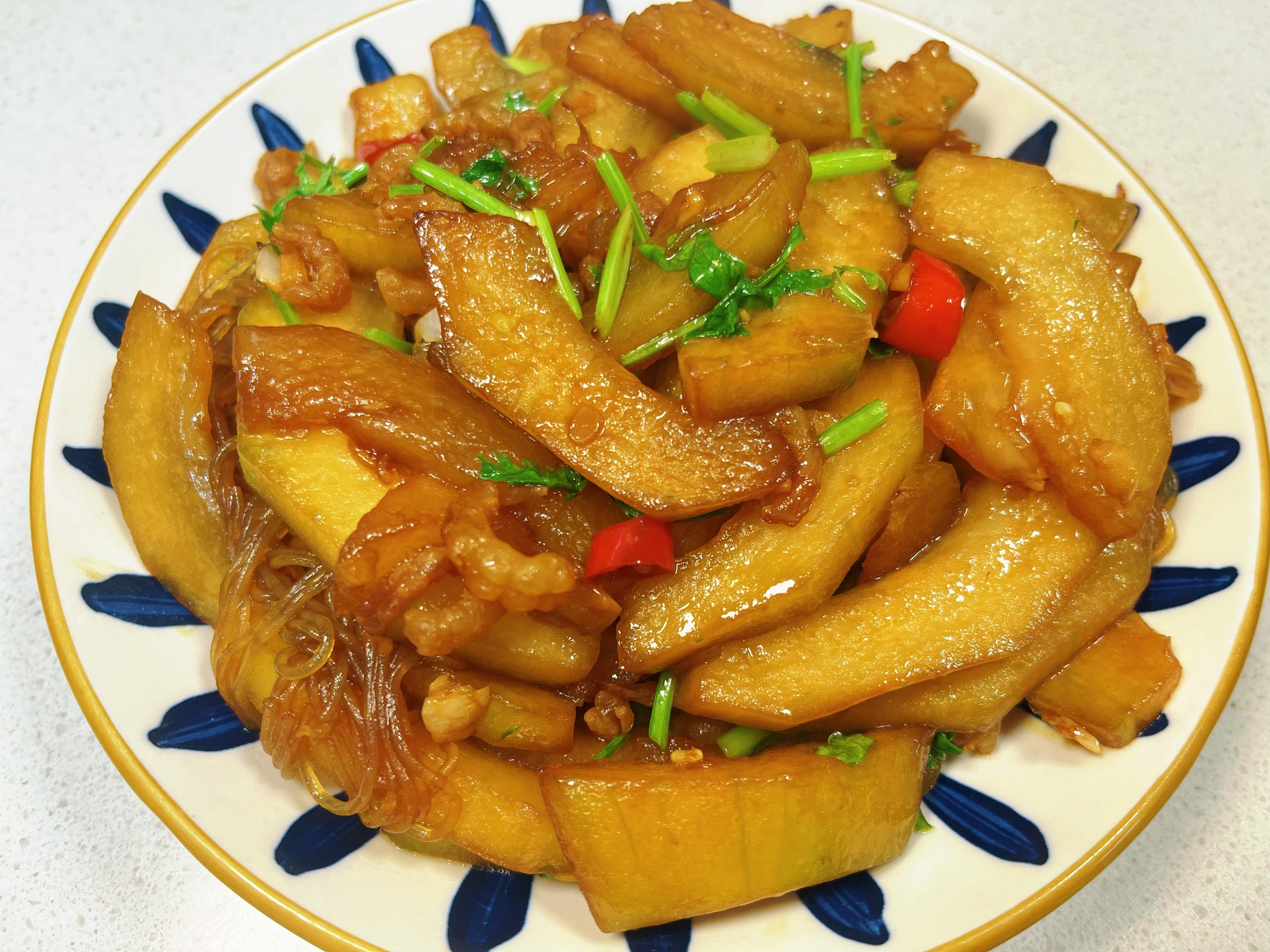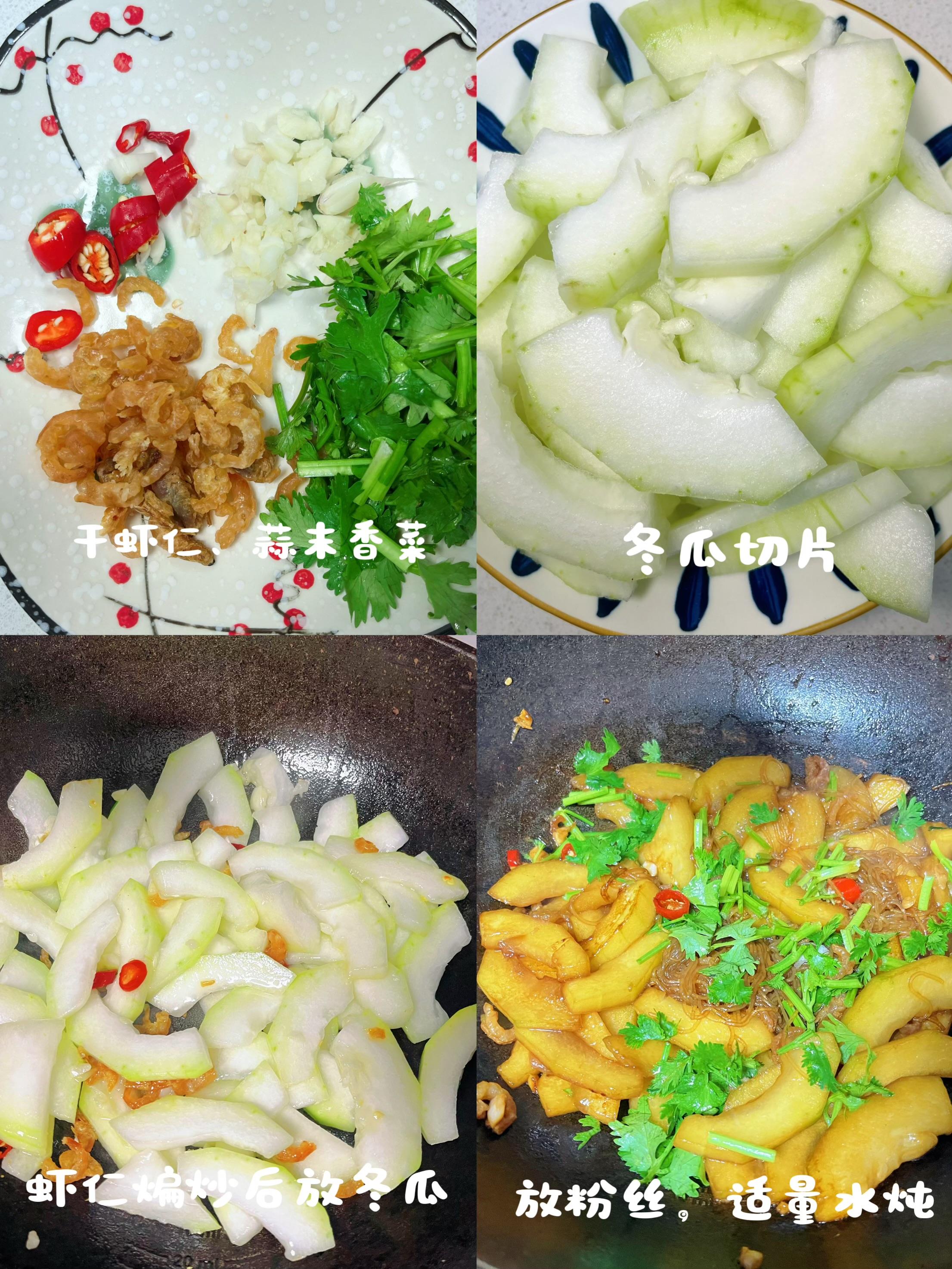 1、冬瓜切成稍厚的片或粗條。蝦皮稍微沖洗瀝乾(如果很鹹,可快速過水)。龍口粉絲用涼水泡軟(大約5-10分鐘),撈出瀝乾,剪短一些方便喫。