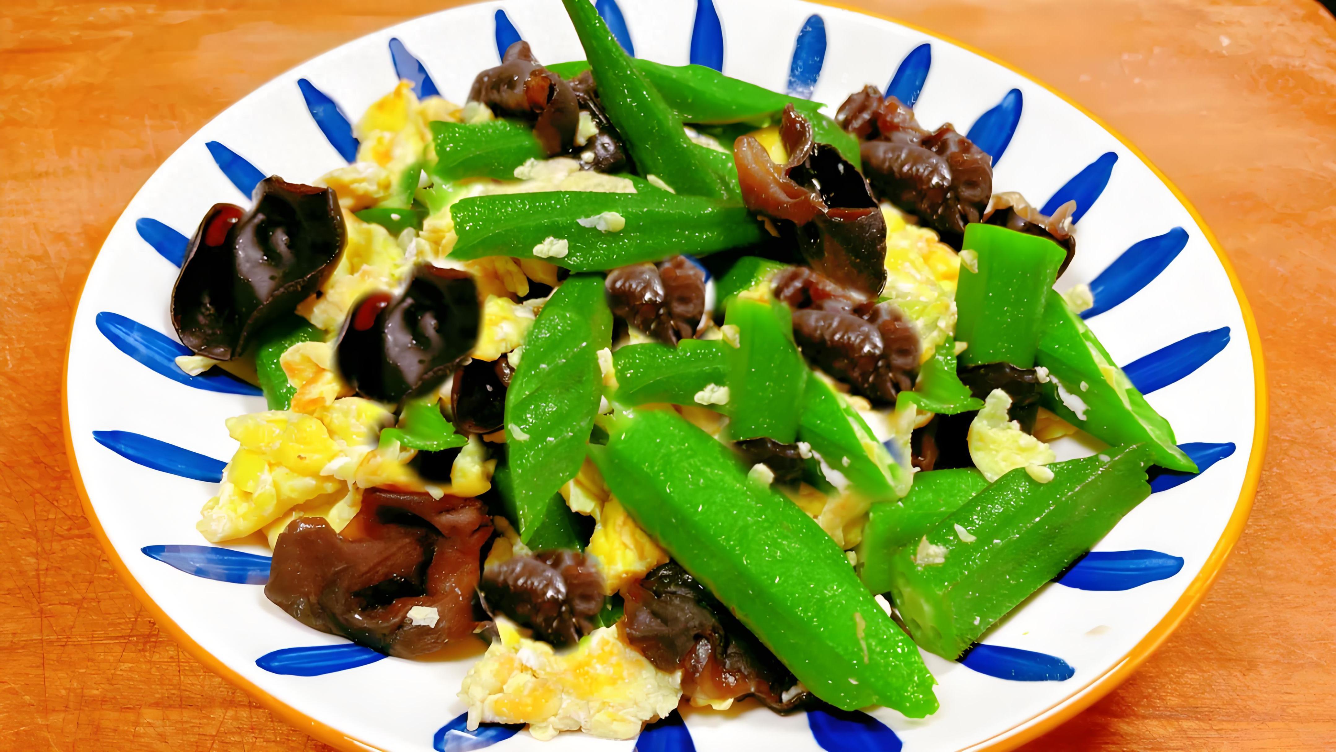 材料備齊: 新鮮秋葵一小把、幹黑木耳一小撮(提前泡發好)、雞蛋2-3個、蒜末少許、鹽適量、生抽幾滴(提鮮)。