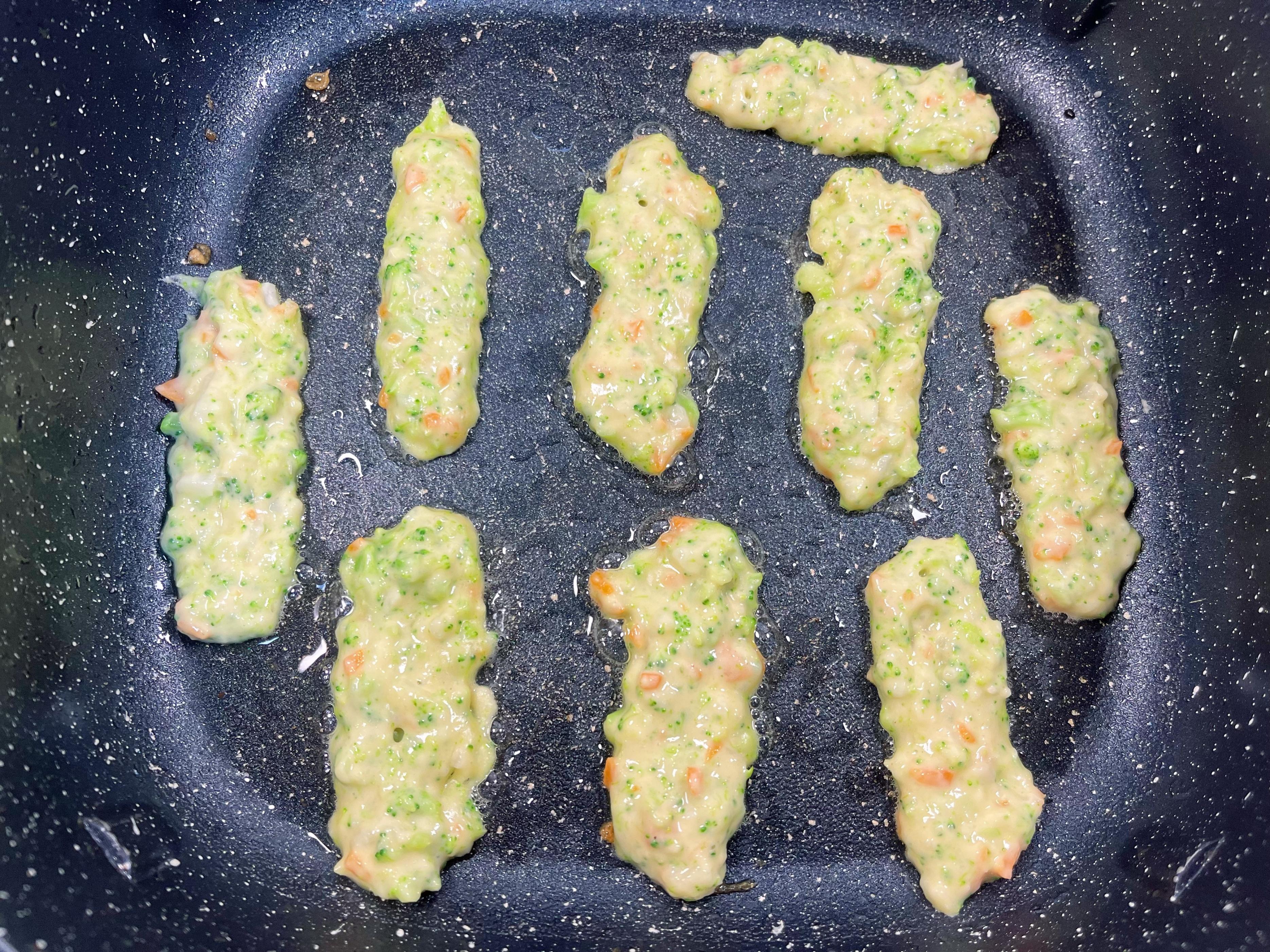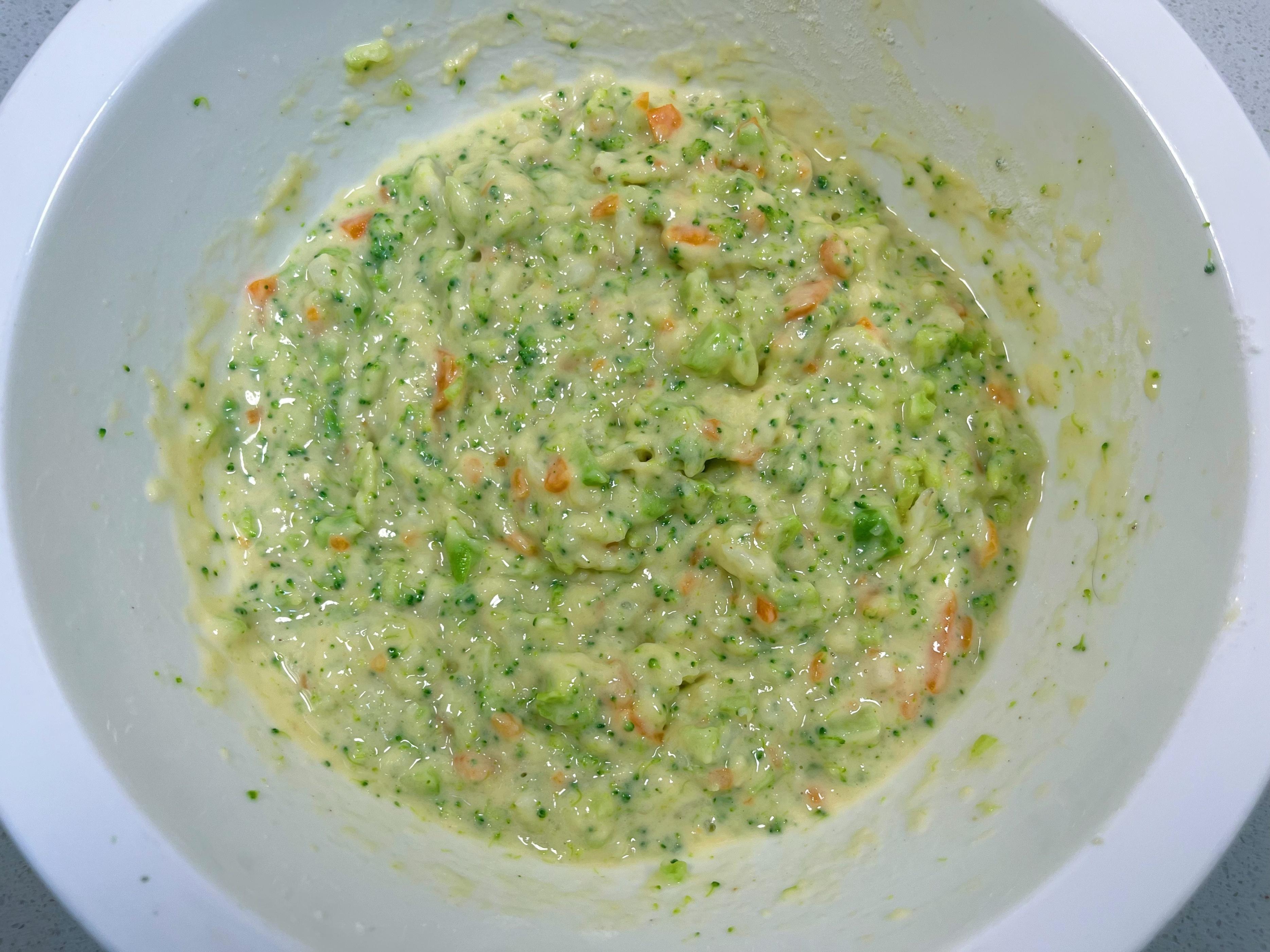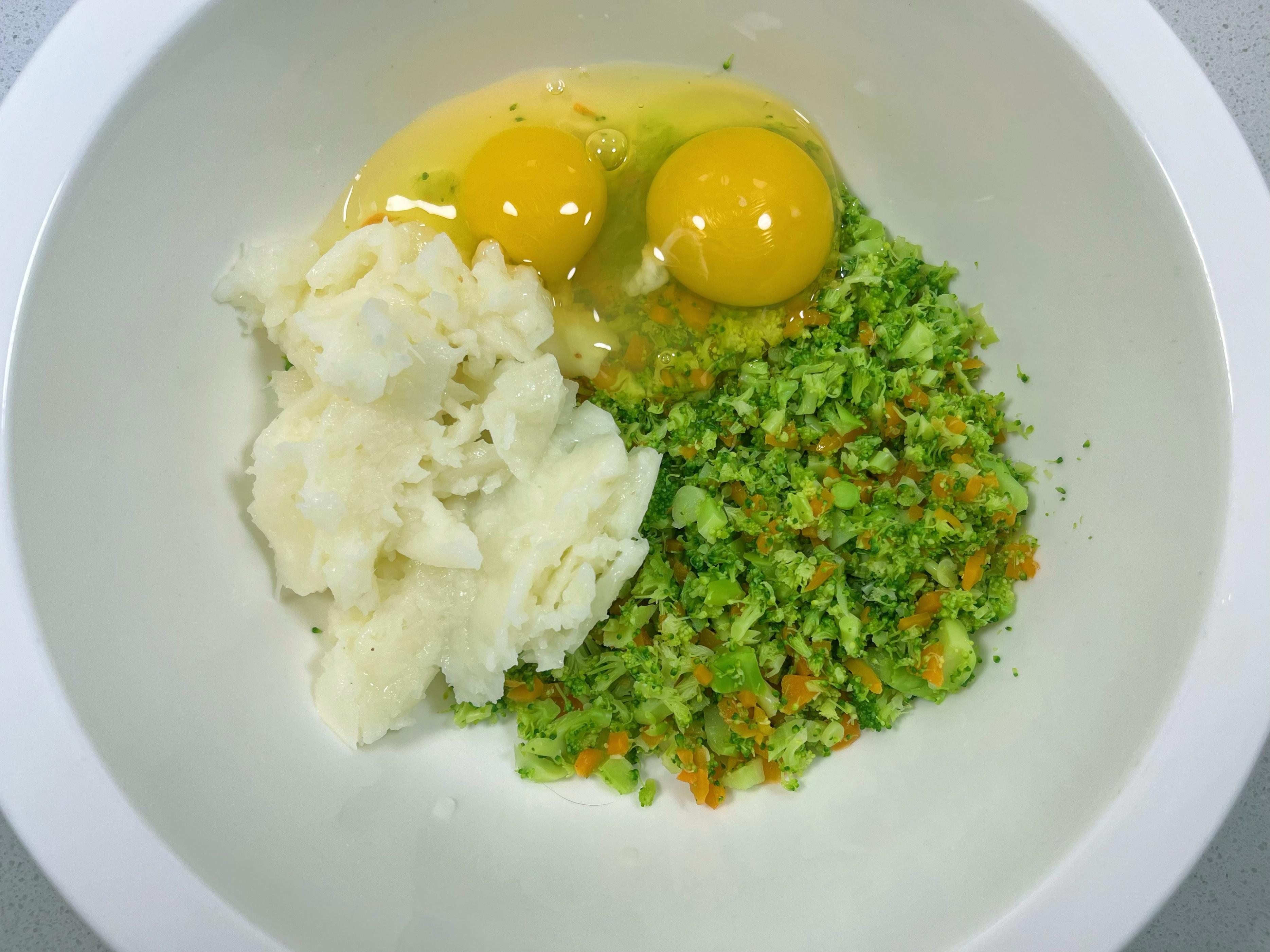 3、蒸好的山藥稍稍放涼,磕入三個雞蛋,直接上手或藉助工具,把山藥塊壓成細膩的泥,與蛋液充分攪打融合。接着,胡蘿蔔碎、西蘭花碎、麪粉、鹽、胡椒粉統統請進來。加一小勺清水(約20ml),攪啊攪,攪成一種稠酸奶般順滑流動的麪糊。麪粉量不是鐵律,稠了加點水,稀了添點粉,家常做飯,手感最可靠。