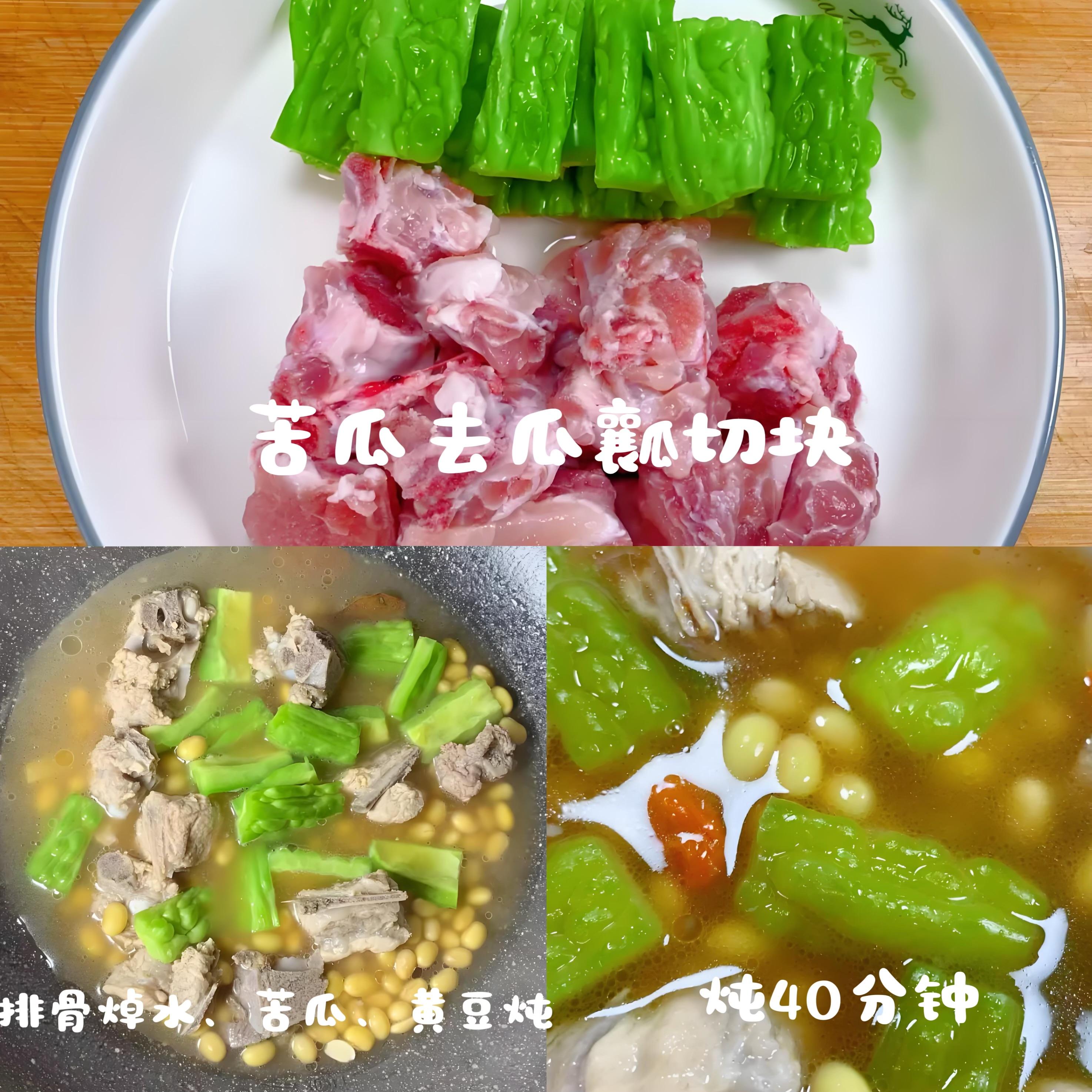 材料: 排骨半斤,苦瓜1根,黃豆一小把,生薑幾片