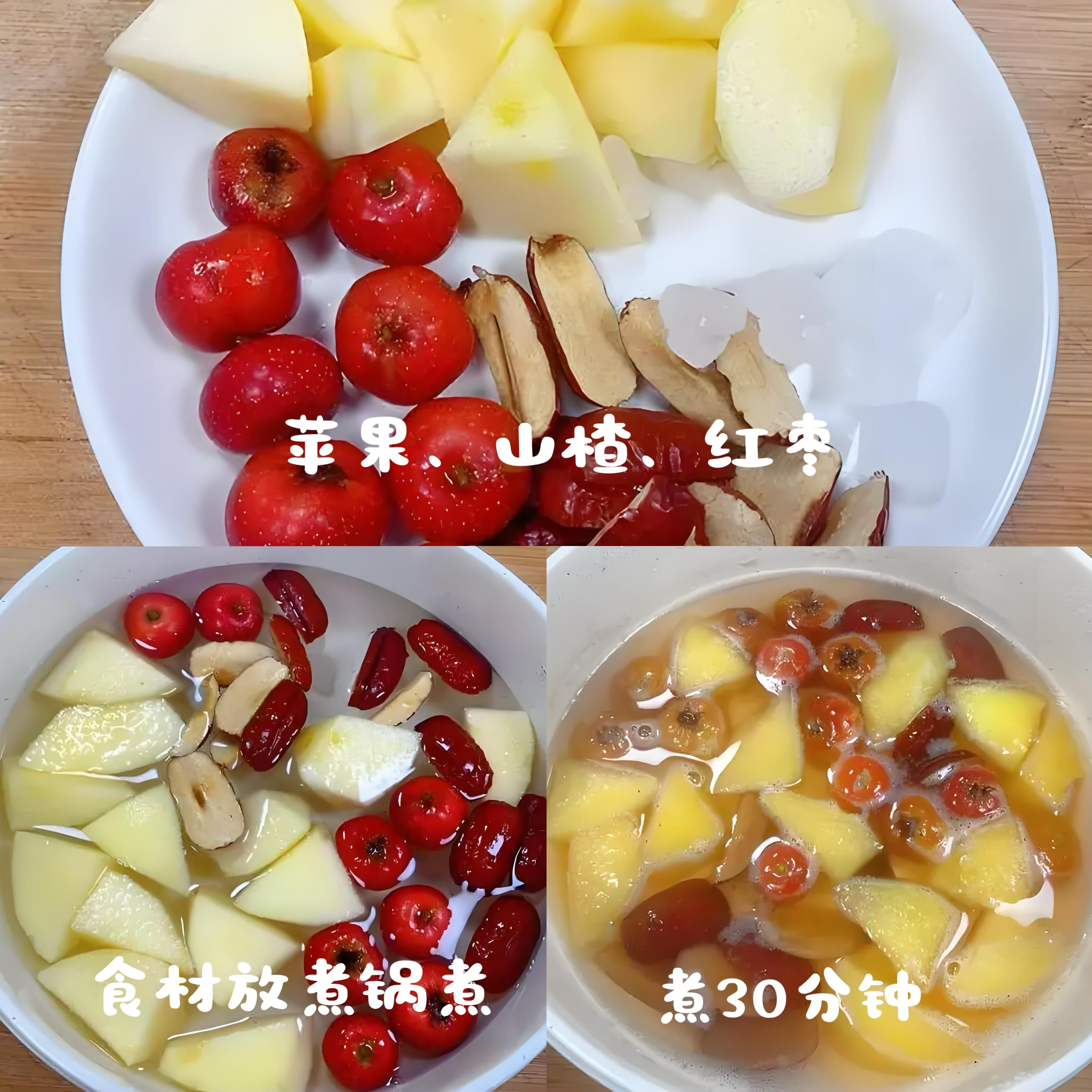材料: 大蘋果1個,紅棗6-8顆,新鮮山楂,冰糖或蜂蜜適量