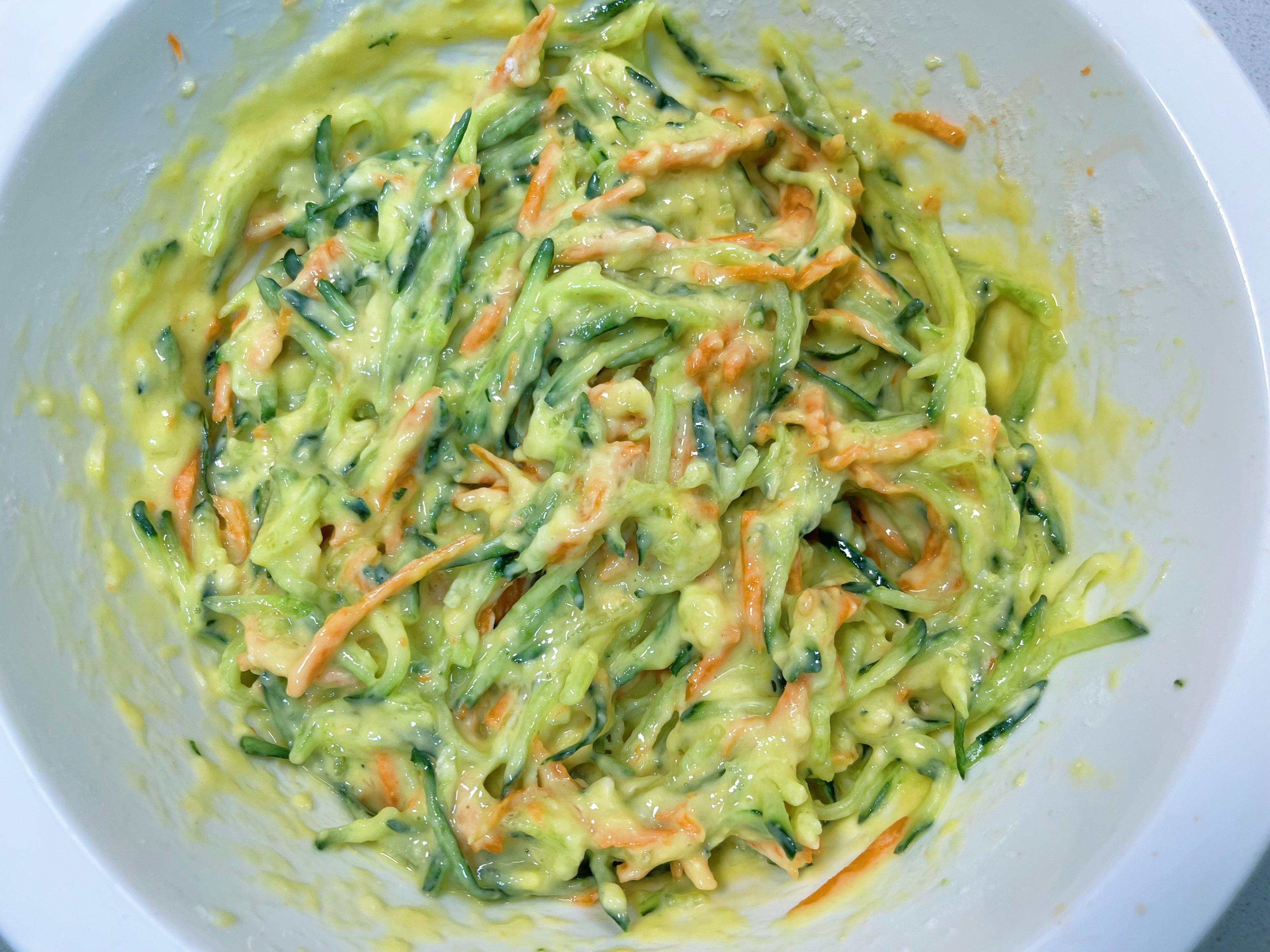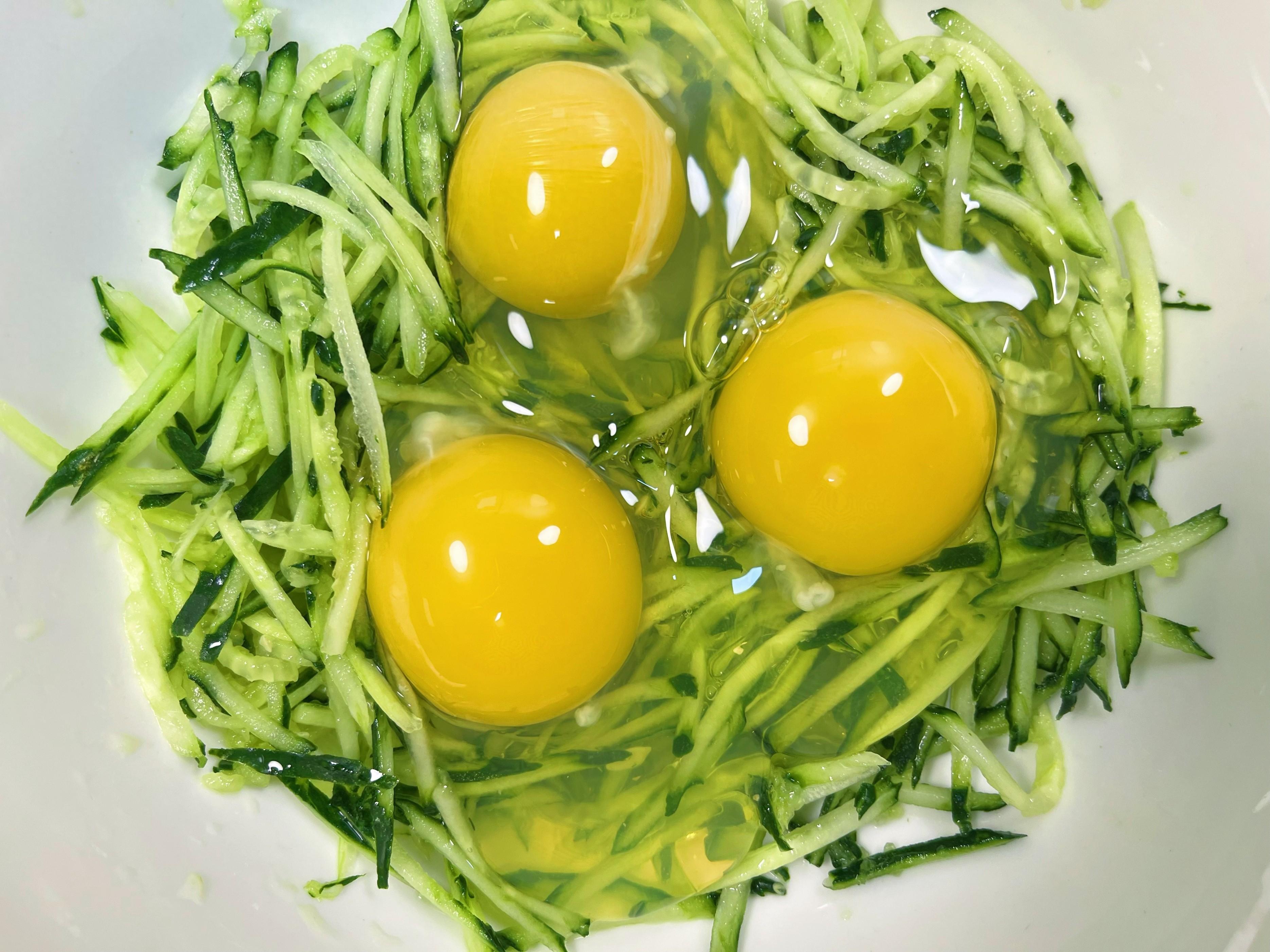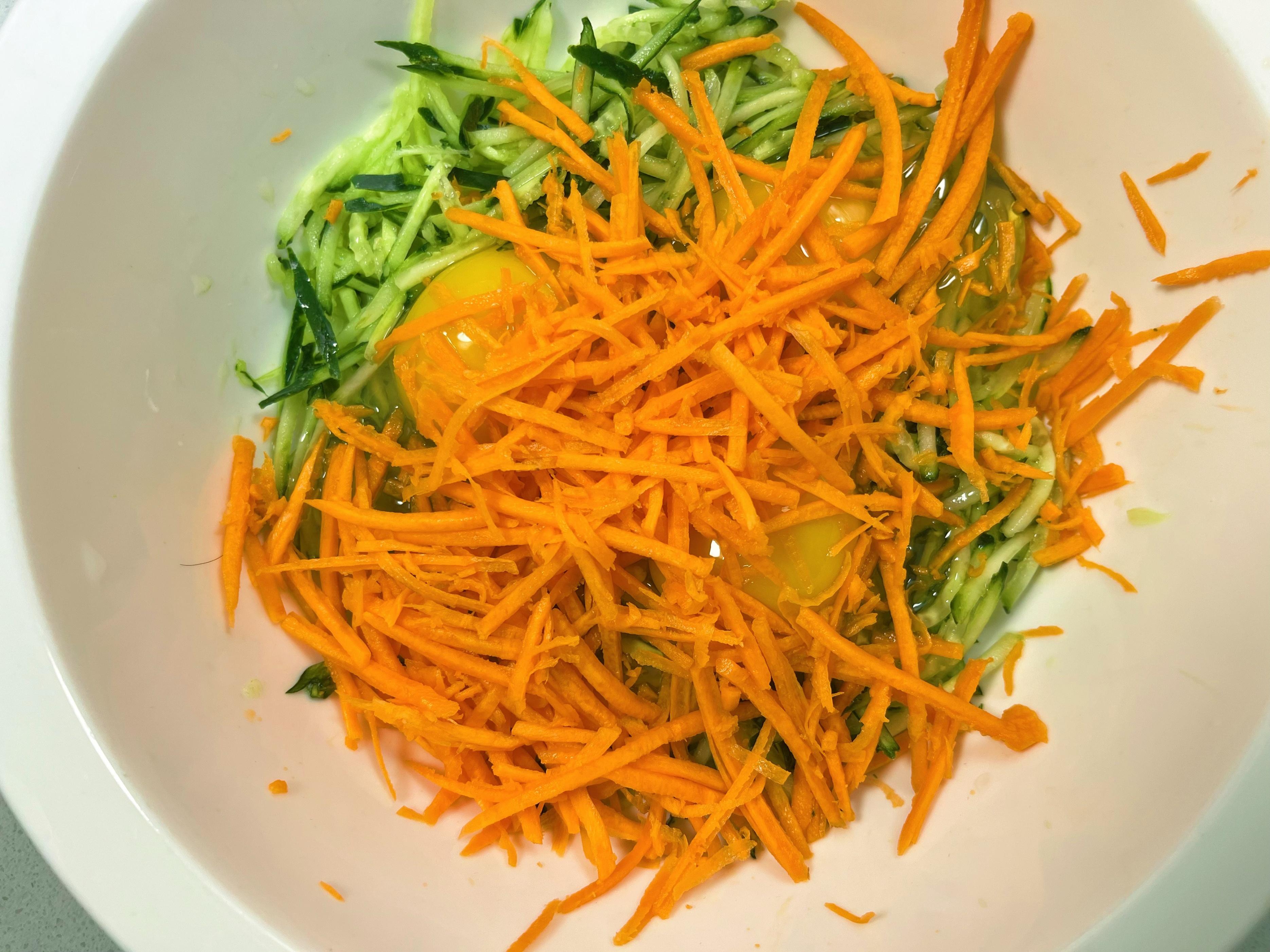 1、黃瓜絲、胡蘿蔔絲先放入大碗中。打入兩枚新鮮雞蛋,用筷子或打蛋器充分攪打均勻,讓蛋液溫柔包裹住每一根細絲。
