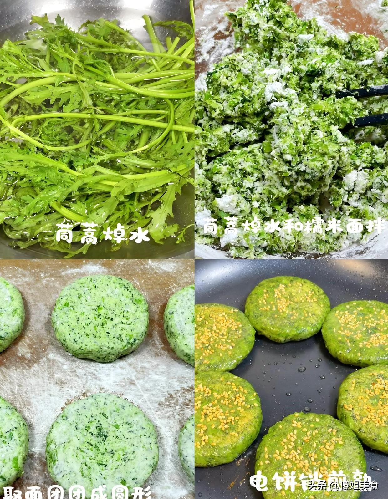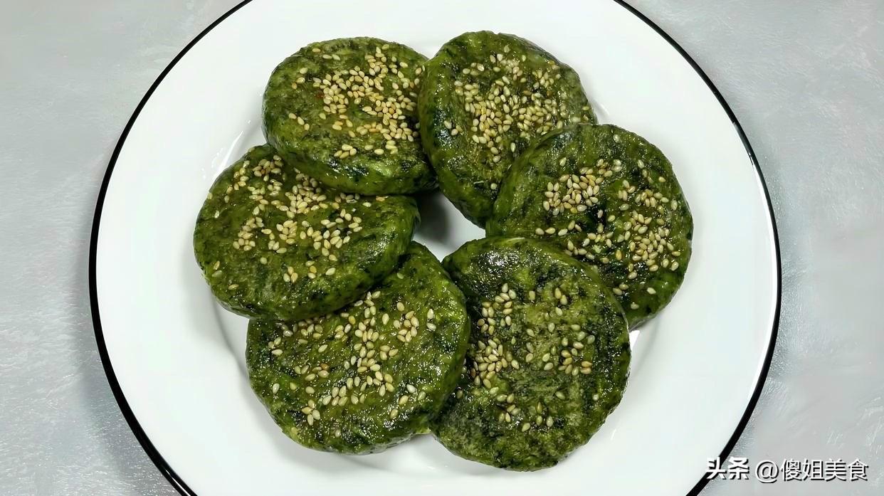 平底鍋刷薄油,小火把小餅兩面煎到金黃熟透。外皮微脆,內裏軟糯,滿口都是茼蒿的清香!