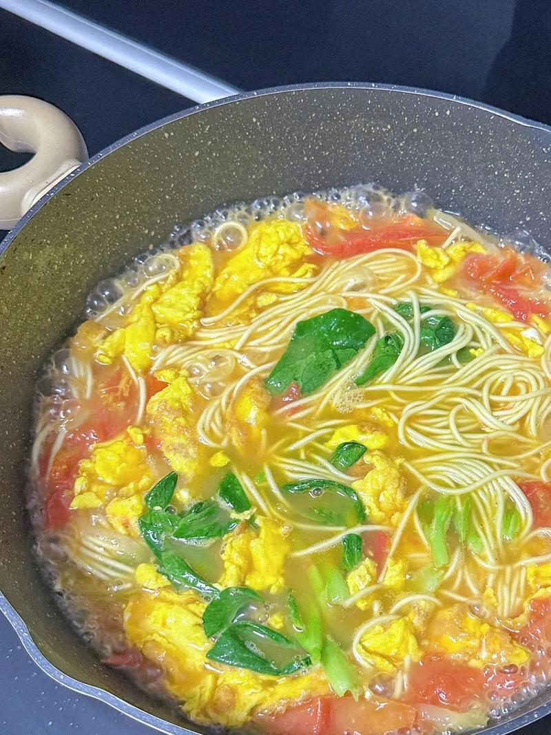 5鍋裏燒熱水,來煮麪條,麪條煮熟,撈起放進碗裏,加入西紅柿雞蛋青菜,拌均勻來喫即可。