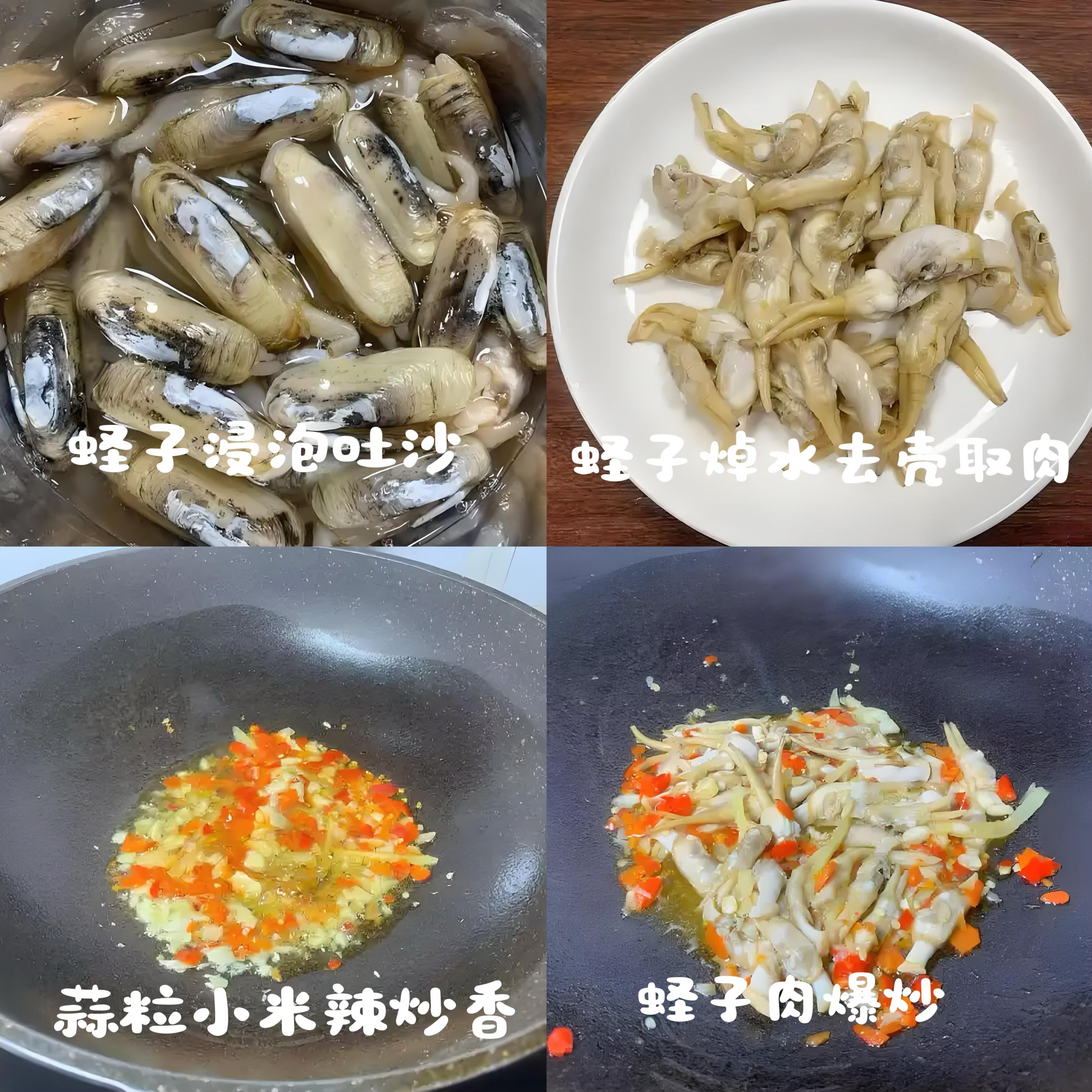 - 食材: 新鮮蟶子一斤、姜蒜末、小米辣、青椒、料酒、生抽、蠔油、鹽、糖少許、蔥花。