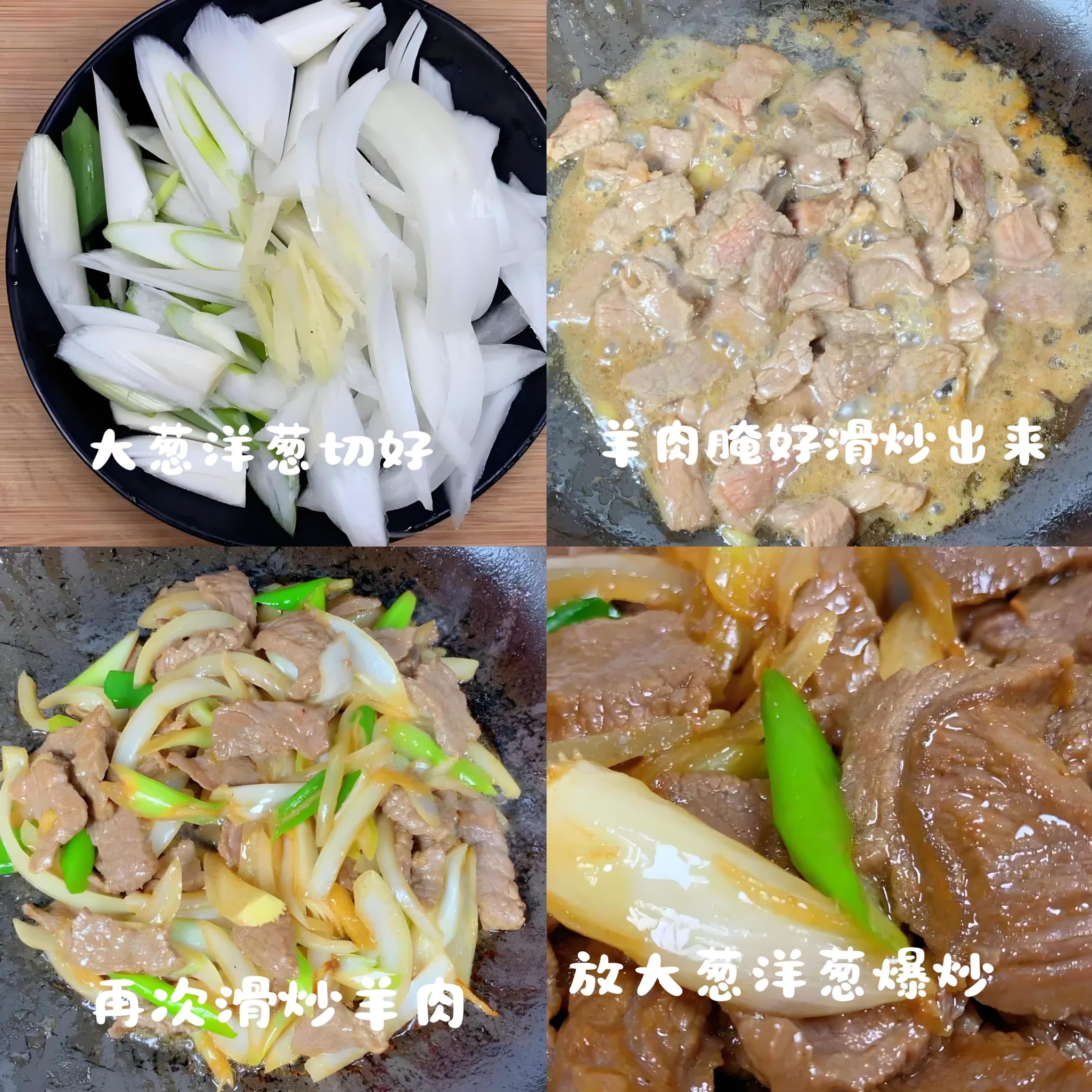 - 食材: 羊肉片(選嫩一點的部位如裏脊或上腦)半斤、大蔥1-2根、薑絲少許、料酒、生抽、老抽幾滴(調色)、鹽、糖少許、白胡椒粉、澱粉。