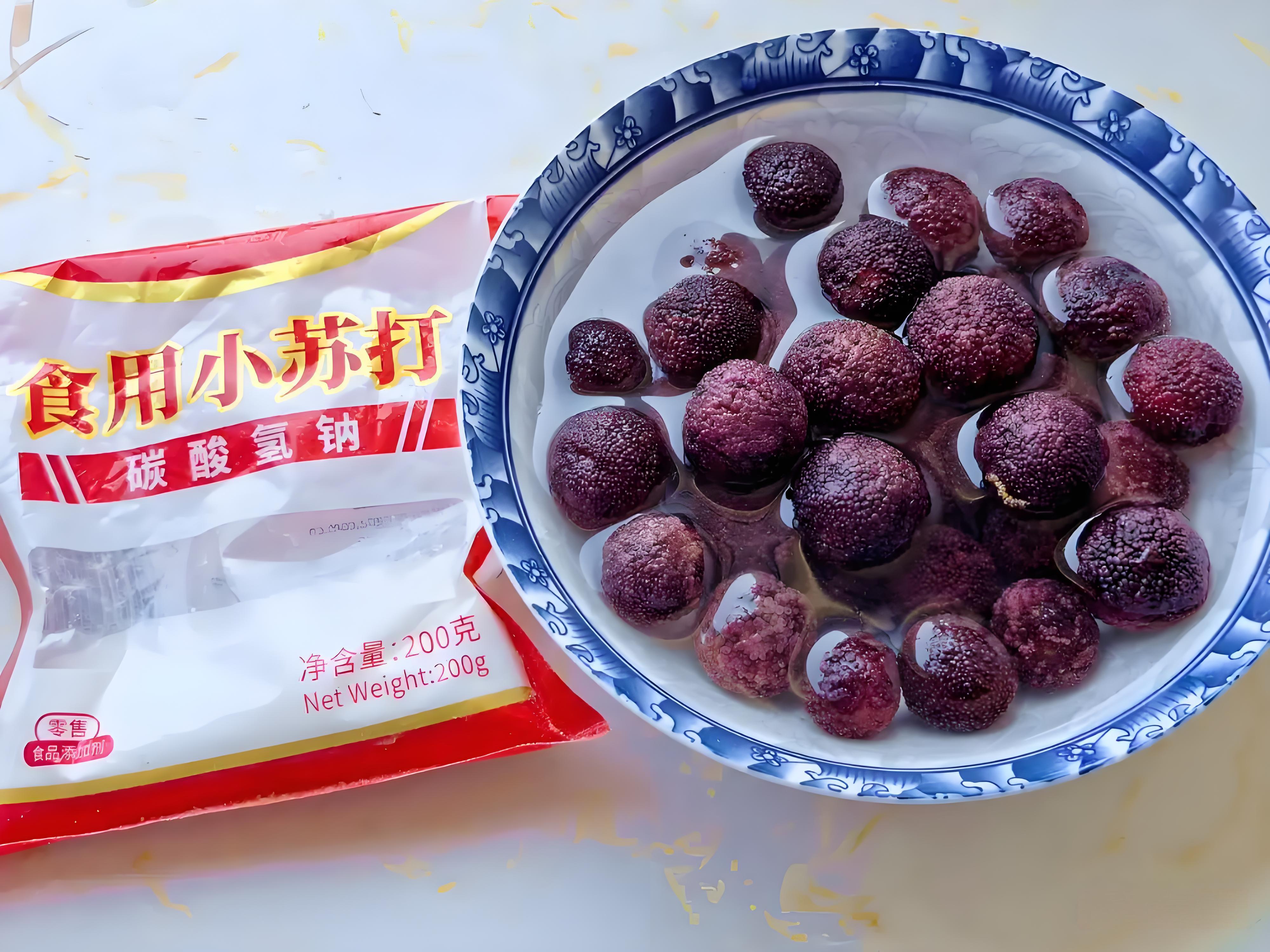 材料準備:新鮮楊梅、食用小蘇打、食用鹽、乾淨的清水