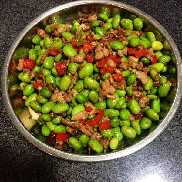 食材;毛豆粒適量,五花肉,鹽, 生抽,紅椒1個