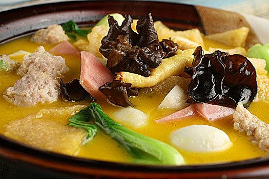 食材:肉丸子,火腿,青菜,香菇,鵪鶉蛋,鹽, 胡椒粉,香油, 蔥