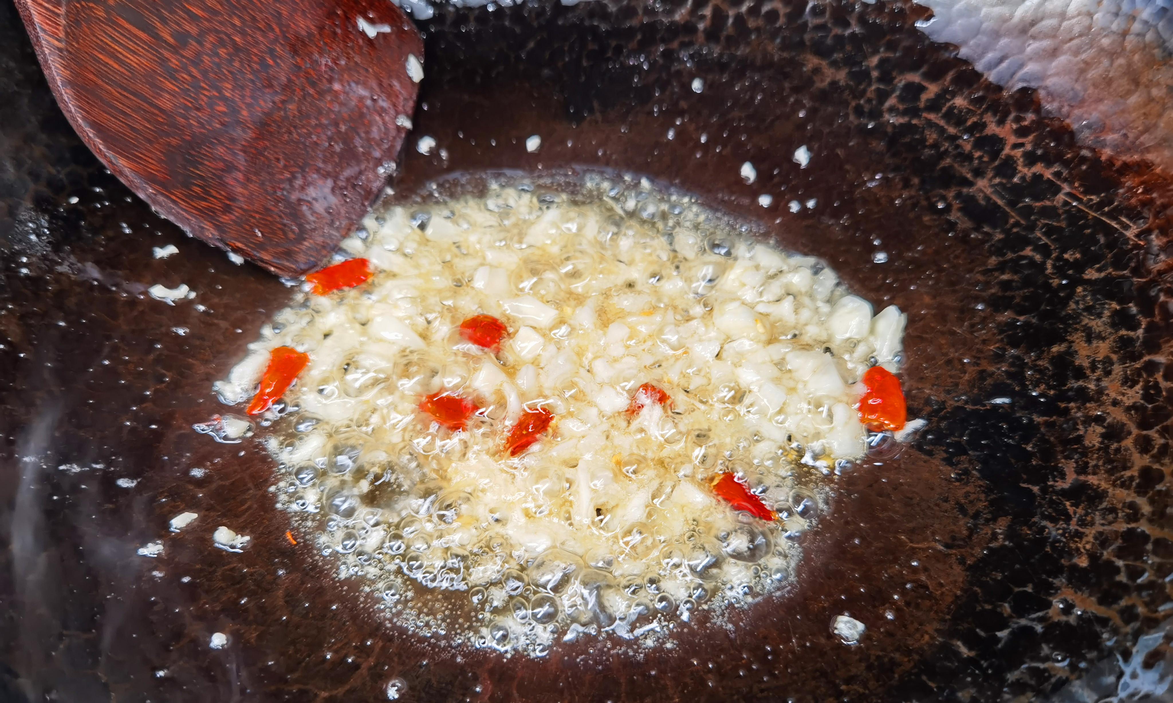 4、別等蒜末變黃!瞅準了,立刻倒入揉好的紅薯葉!動作要快!“嘩啦”一聲,帶着潮氣的葉子撲進滾油。趕緊抄起鍋鏟,上下翻飛,讓每片葉子都裹上熱油和蒜辣香。