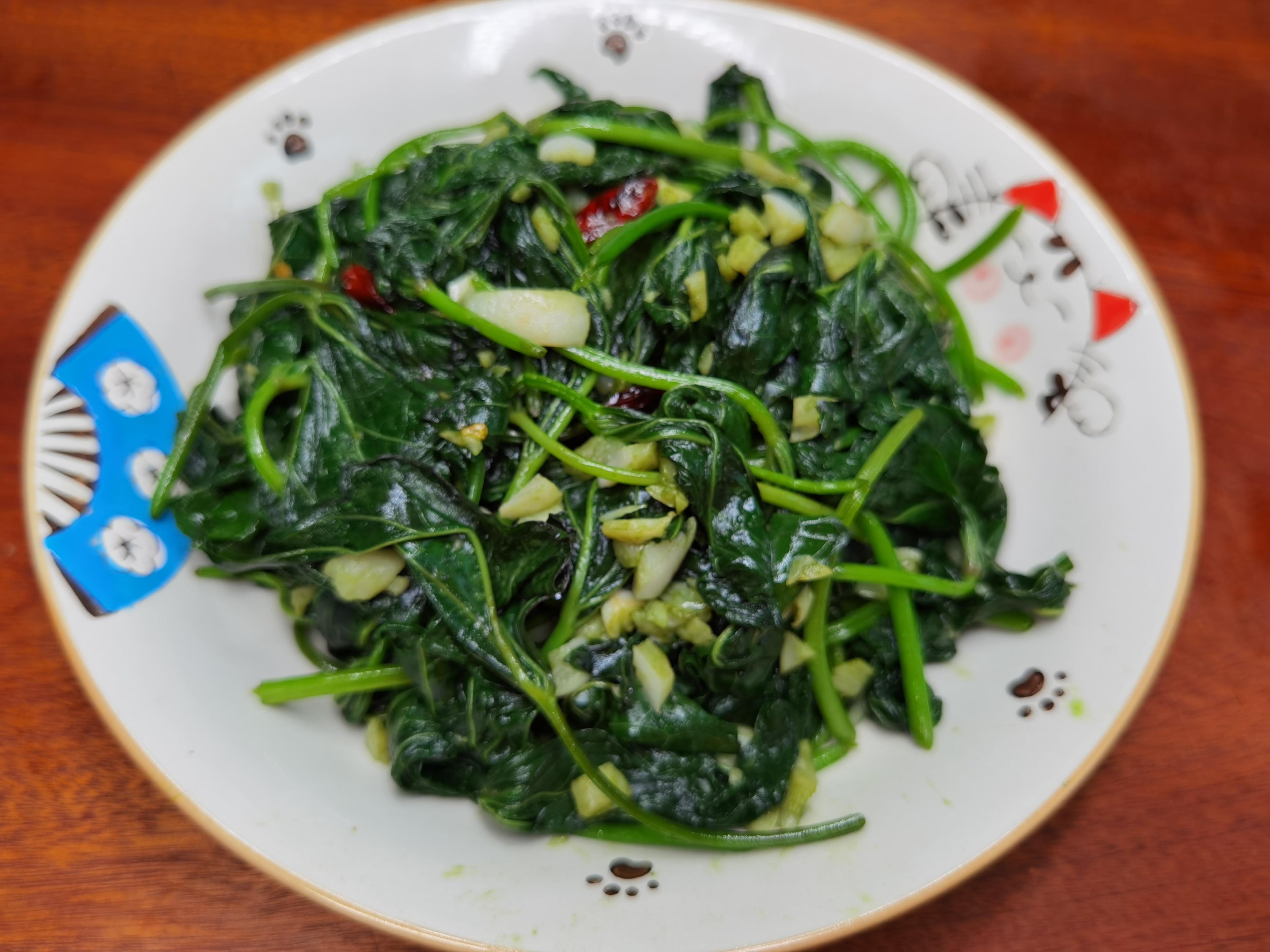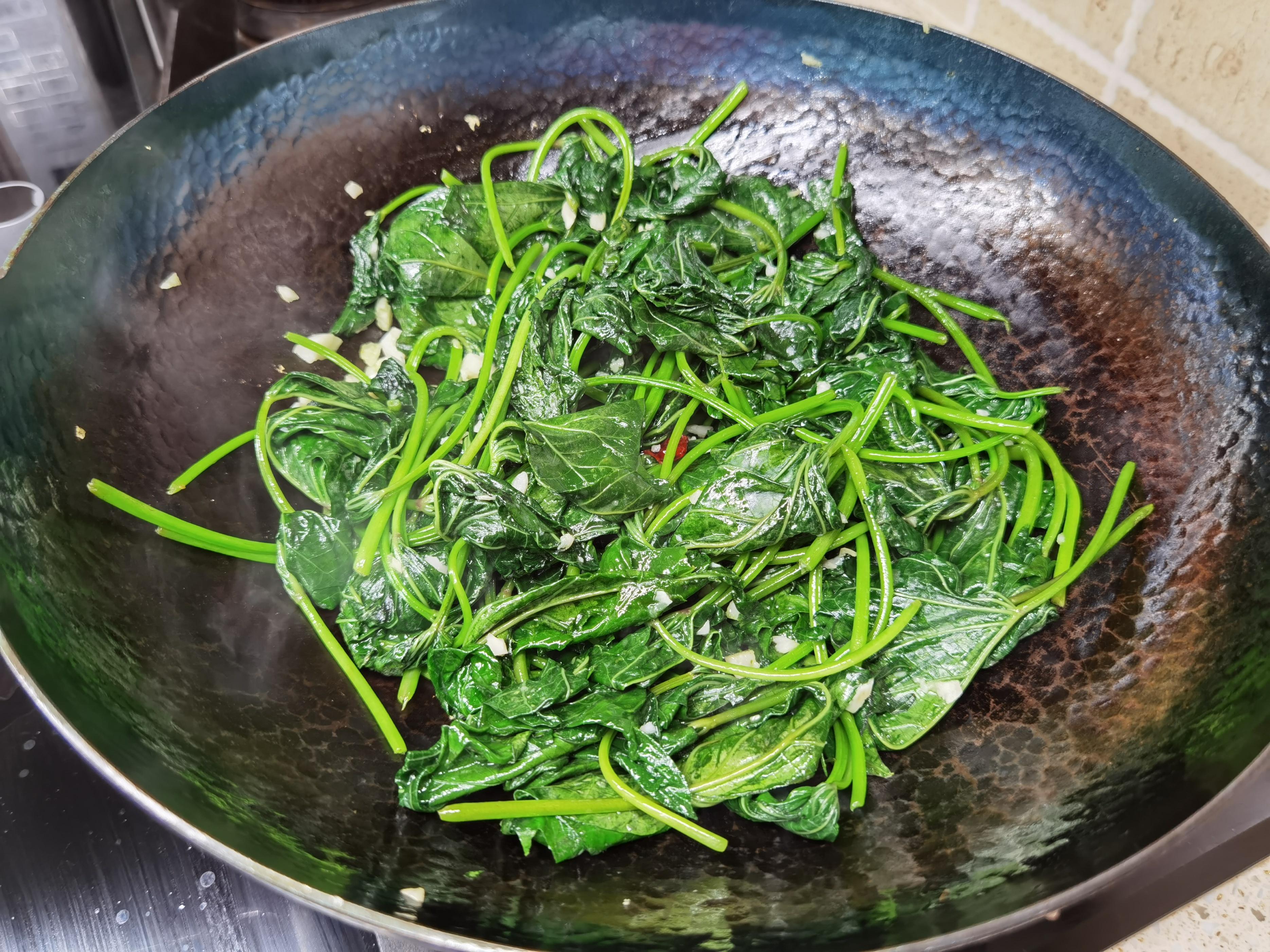 5、全程大火別慫!這是葉子保持油亮翠綠、口感爽利的關鍵!快速翻炒,大約一分鐘多點,看到葉子徹底塌軟、顏色油亮誘人就行了。