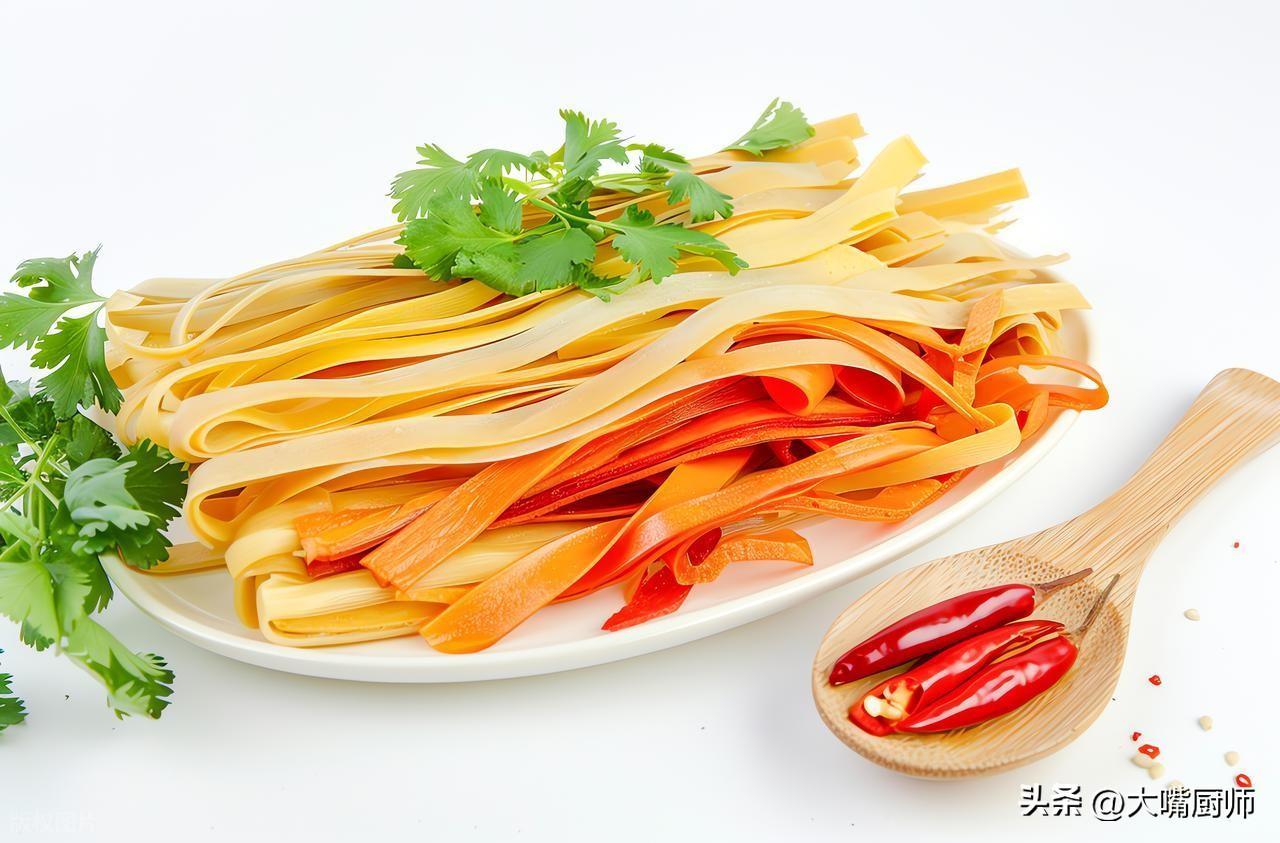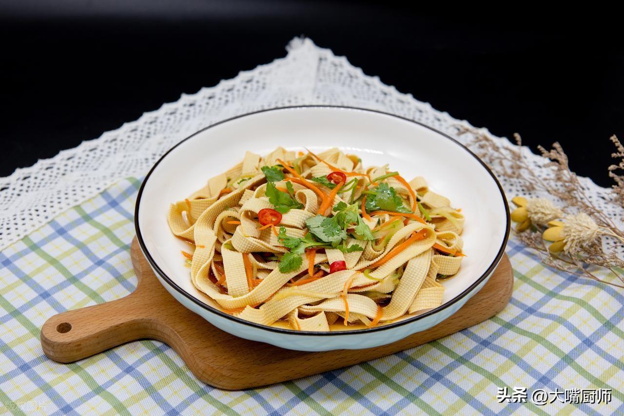 這道素菜的主角是豆皮。豆皮,作爲豆製品家族的一員,價格親民,營養豐富。它富含蛋白質、鈣等多種營養成分,口感軟嫩又不失韌性,是製作美味素菜的理想食材。夏天,我們可以製作涼拌豆皮,非常的好喫!