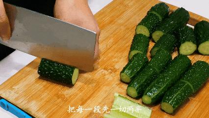 第一步:先把黃瓜清洗乾淨,去掉頭尾口感不好的部分,然後切成長段,再從中間劈切成長條,切好後放到盆裏,加入2勺鹽和2勺白糖,攪拌均勻後醃製上2個小時,剎剎黃瓜裏面的水分,這是黃瓜脆爽好喫的關鍵。
