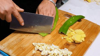 第二步:再準備幾個青椒洗淨、控幹水分後、去籽切成塊備用;生薑一塊切片備用;大蒜適量切成蒜片備用。