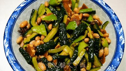第五步:黃瓜剎出水分後,再用手使勁擠一擠水分,然後放到盆裏,倒上切好的青椒塊、薑片、蒜片和花生米,最後將涼透的料汁倒入,攪拌均勻後蓋上保鮮膜放到冰箱裏冷藏醃製即可,2個小時以後就可以喫了,脆爽嘎吧脆,超下飯!