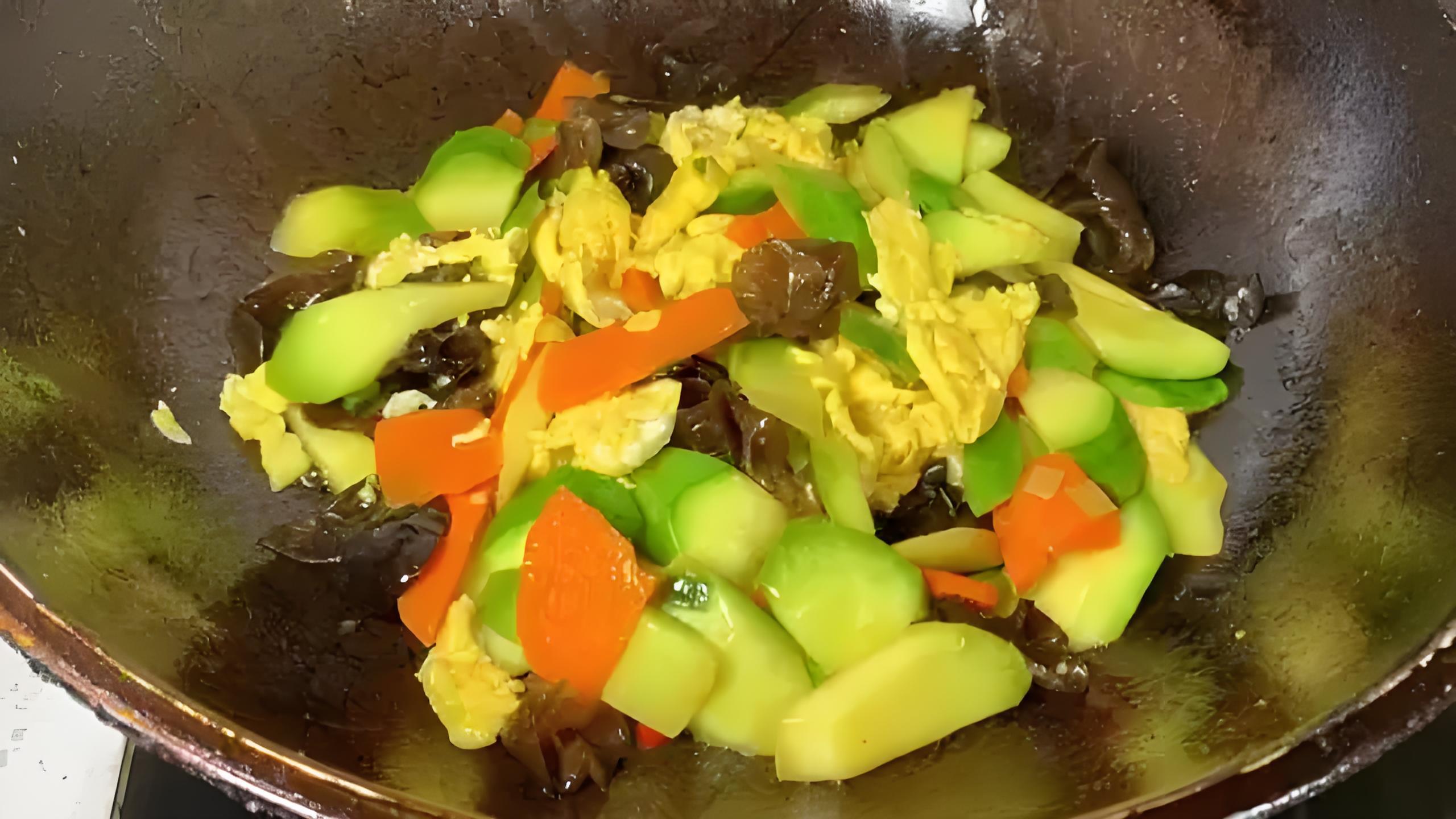 4、轉中大火,先倒入處理好的西葫蘆片,快速翻炒約一分鐘,西葫蘆顏色愈發鮮亮。接着加入木耳,繼續翻炒均勻。