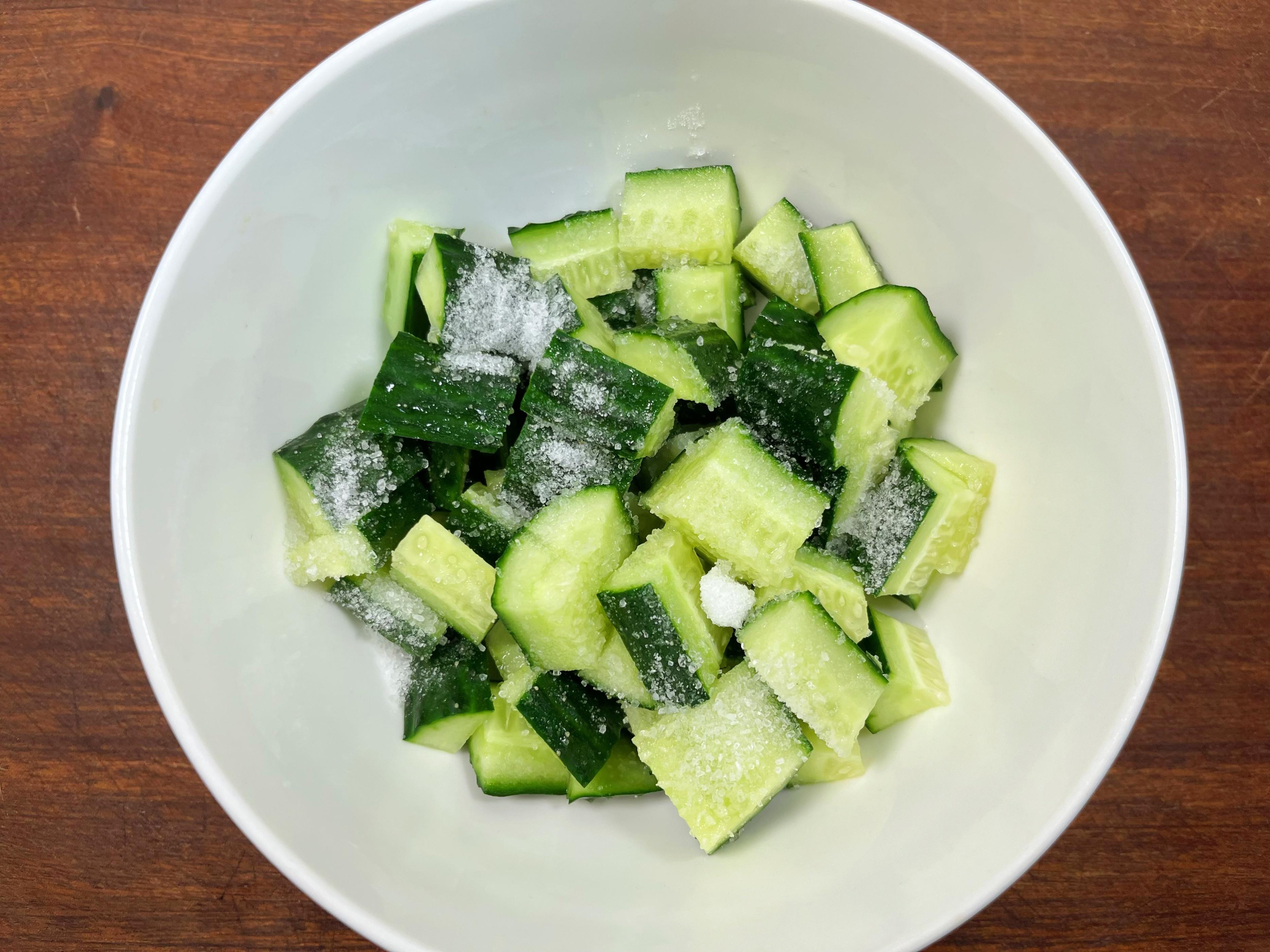 1、黃瓜切片(或條)入盆,撒一小勺鹽(別多!),上手輕柔抓勻,讓鹽粒初步接觸瓜片;
