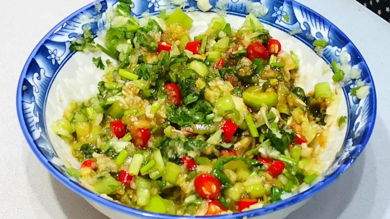 3、接着是賦予香辣的靈魂:將辣椒切碎,放入碗中,香菜一把切成段,然後把它們全都放入蒜泥中攪拌均勻,充分攪勻後再開始調味:加入多一點的鹽,適量的生抽、蠔油再次攪拌均勻即可。