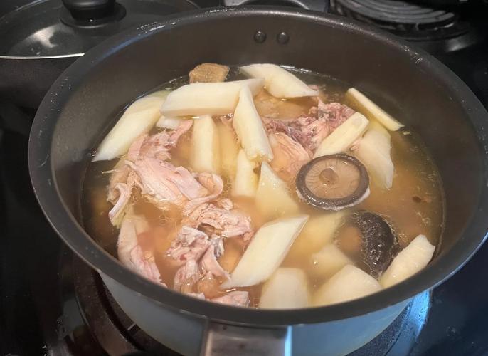 4煮沸後,加入山藥塊,香菇,中小火慢燉