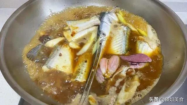4、加入適量熱水,水量要沒過魚身爲宜,這裏有個小祕訣:用啤酒代替水,燉出來的魚肉更嫩還沒腥味!放入煎好的針良魚,加入1小勺白糖和1小勺香醋(糖醋比例3:2最佳),大火燒開後轉中小火燜煮15-20分鐘。記住一個烹飪口訣:“千燉豆腐萬燉魚”,時間足夠才能更入味!