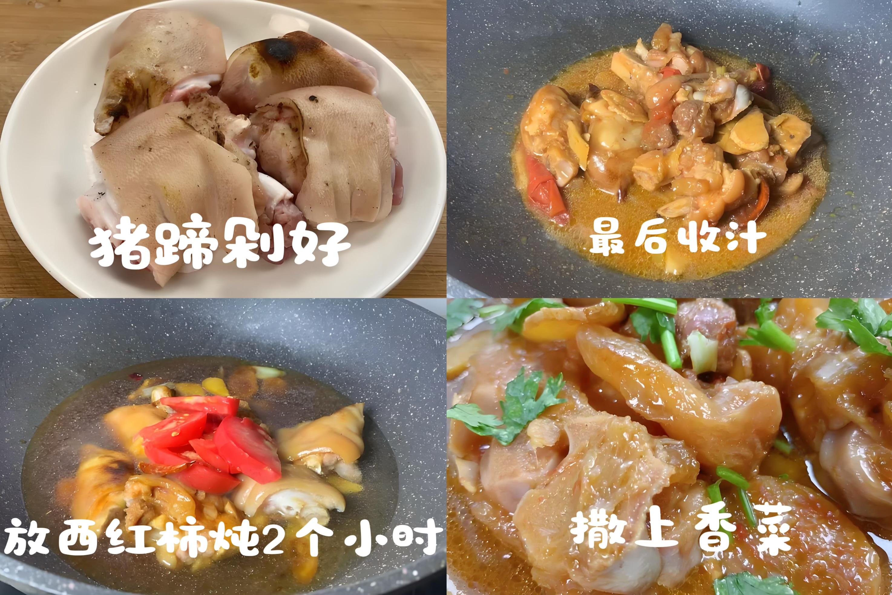 6、繼續燉煮10-15分鐘,讓西紅柿的味道融入湯中,西紅柿塊變軟即可。最後根據口味加入適量鹽調味。 關火,盛出。湯色紅潤,豬蹄軟爛脫骨,西紅柿酸甜可口。