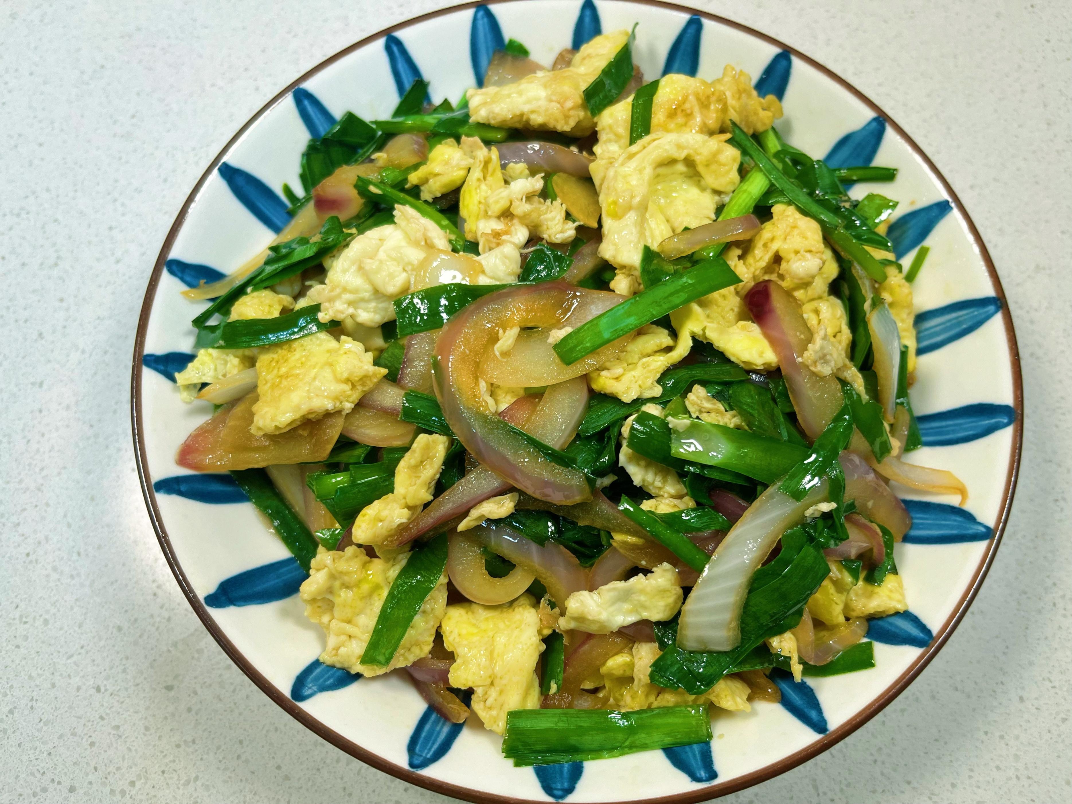 5、立即倒入之前炒好的雞蛋塊和洋蔥丁,快速翻炒均勻。嘗一下鹹淡,根據個人口味補一點點鹽。韭菜斷生即可關火出鍋!韭菜炒久了會發蔫出水,一定要快!