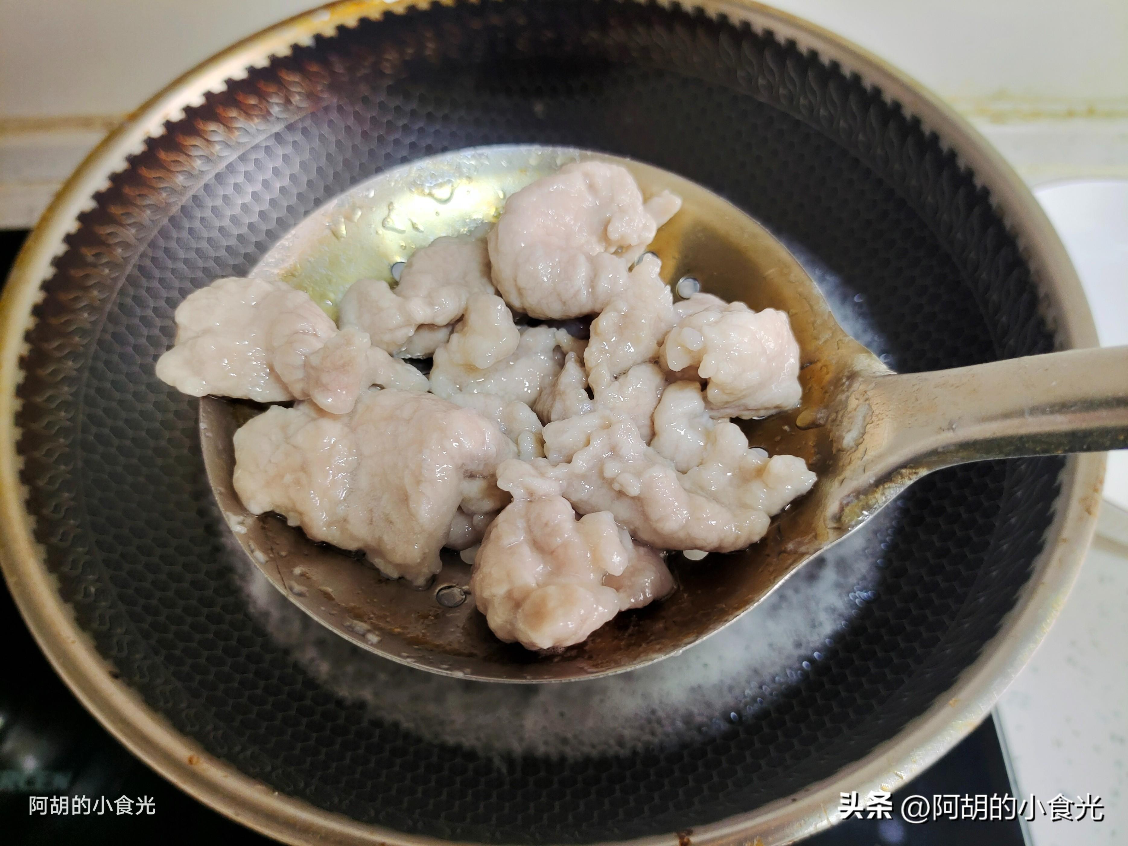 第四步:鍋裏添入一些涼水,保持大火將其煮開煮沸騰。而後關火,將上一步中漿好的肉片一片一片地下入到鍋中,注意不要去攪動鍋內,待所有肉片全部下鍋後就開小火加熱,讓肉片完全變色定型,而後再轉爲大火煮個一分鐘左右就撈出肉片,漿撈出的肉片放入涼水中冷卻一下,這樣肉片外層的紅薯粉漿不會脫落,也不會渾湯。