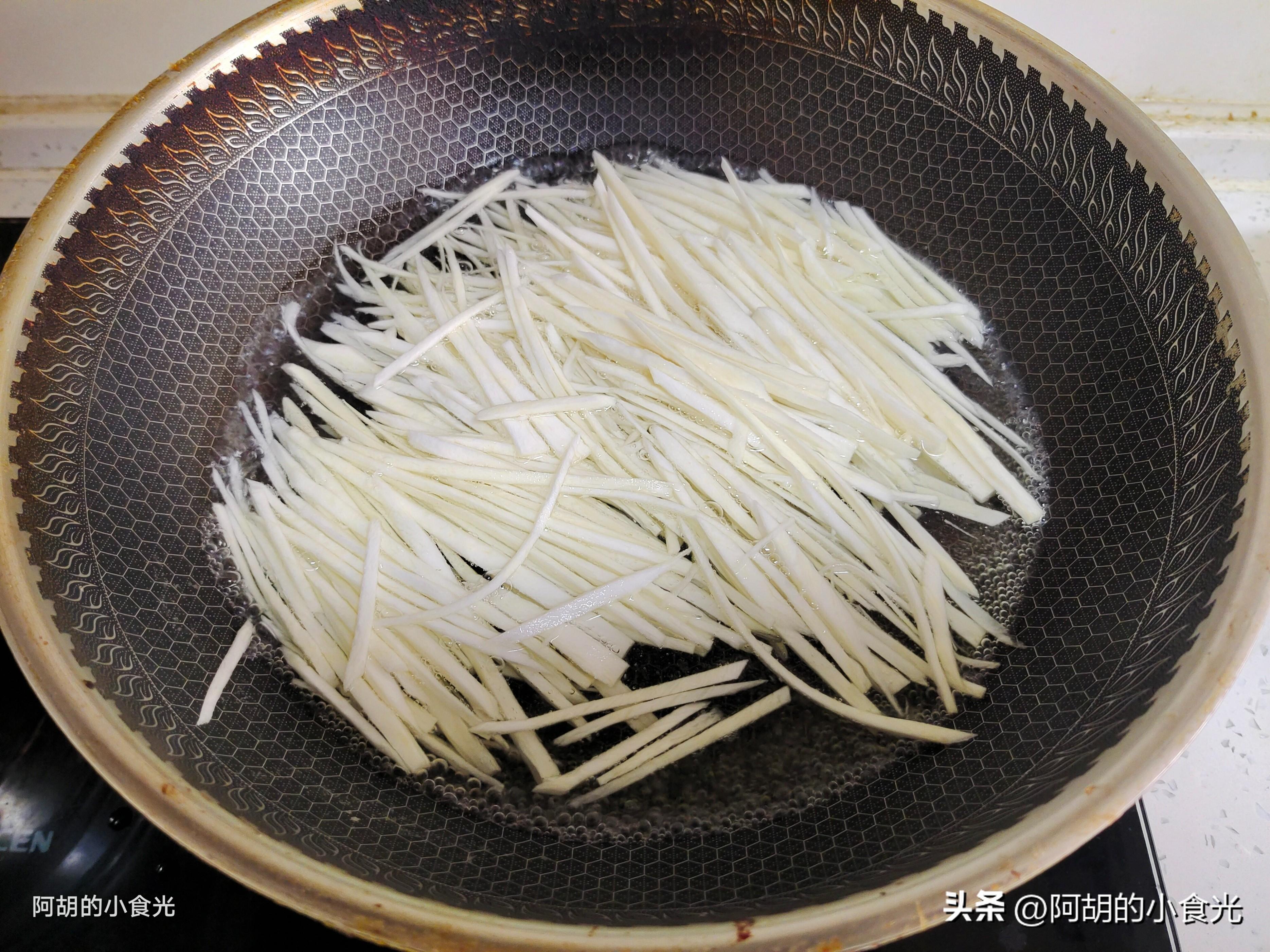 第一步:準備新鮮的茭白兩根,剝去外殼後再將茭白肉的外面削去一層,而後再將其切片後再切絲放入盆中待用。因爲茭白含有較多的草酸物質,這裏建議先把茭白焯燙一次,撈出後放一邊瀝乾水分備用。