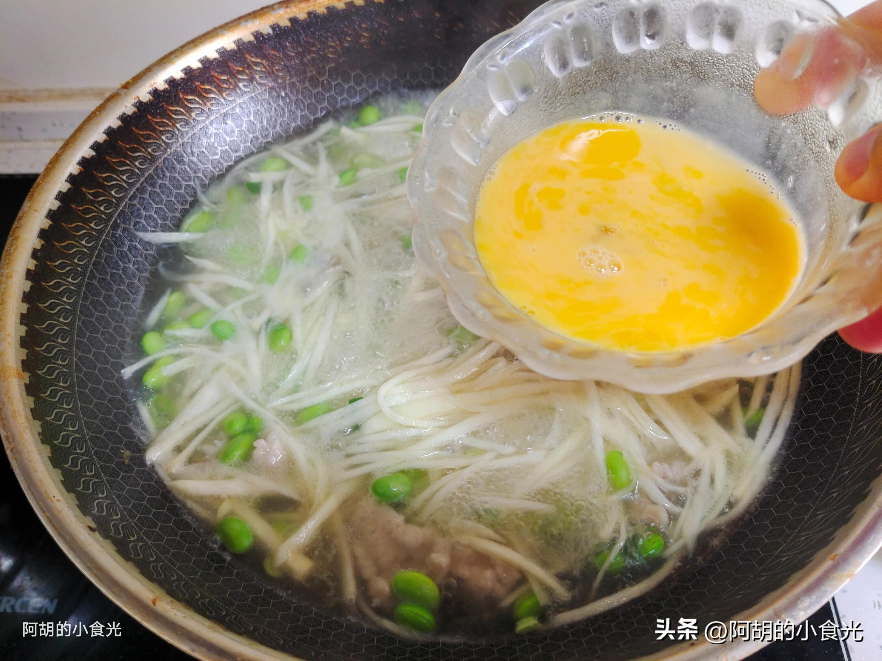 第七步:最後將兩個雞蛋攪碎後淋入鍋中,待雞蛋凝固後撒入一些香菜碎就可以出鍋裝盤了。很是鮮美開胃的一道湯菜,脆嫩的茭白絲,滑嫩的肉片,有湯有菜夏天來一鍋恰到好處,感興趣的一定要試一試這個喫法。