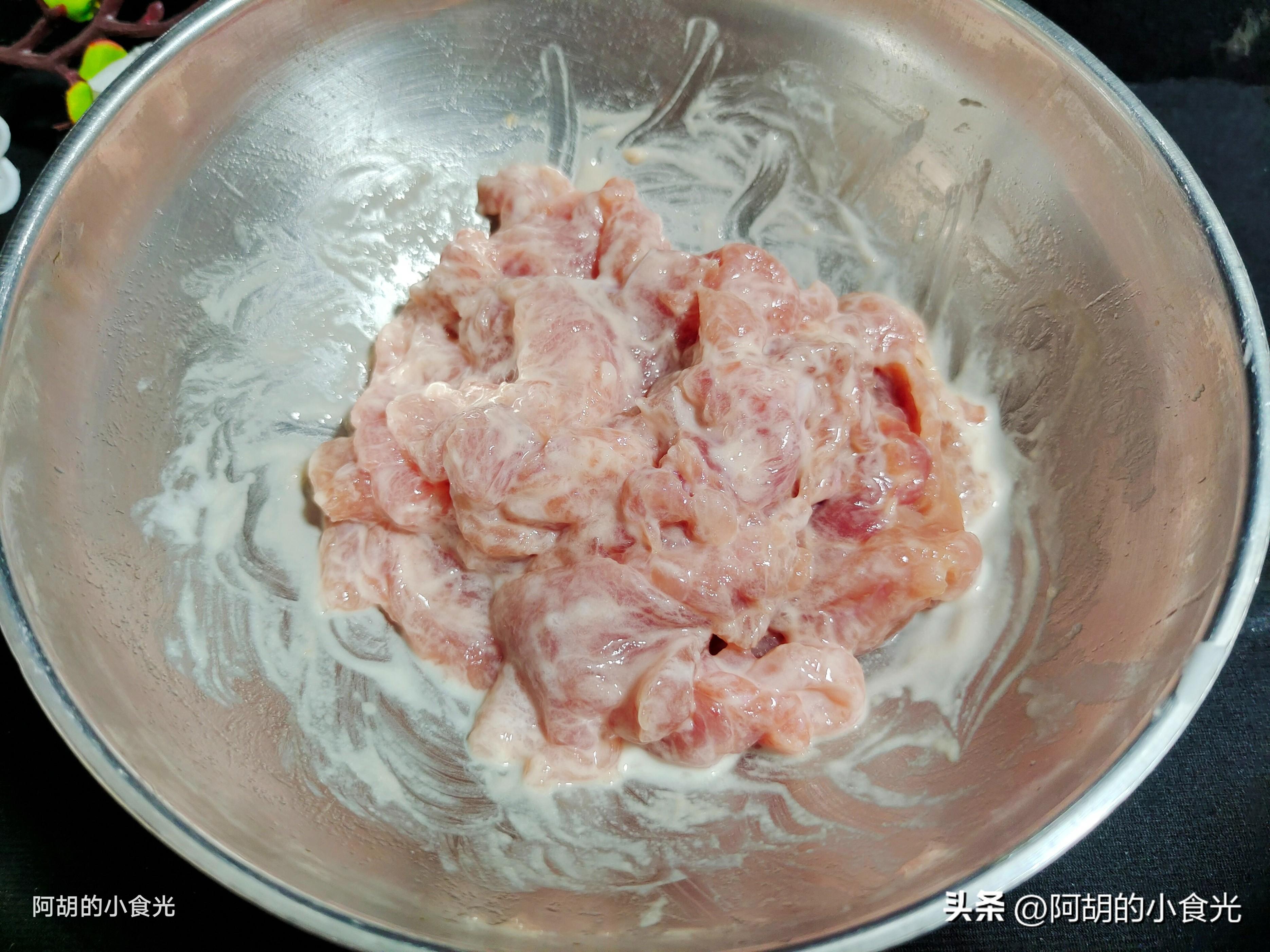 第三步:準備一塊豬瘦肉,這裏建議選用梅花肉的部位,將其切成肉片後放入碗中。加入一些食鹽和蠔油攪拌均勻,讓肉出現一些黏性。而後用少許涼水稀釋兩湯匙的紅薯澱粉成厚厚的粉漿。把粉漿倒入肉片中,再次抓拌均勻,讓肉片均勻裹滿粉漿。