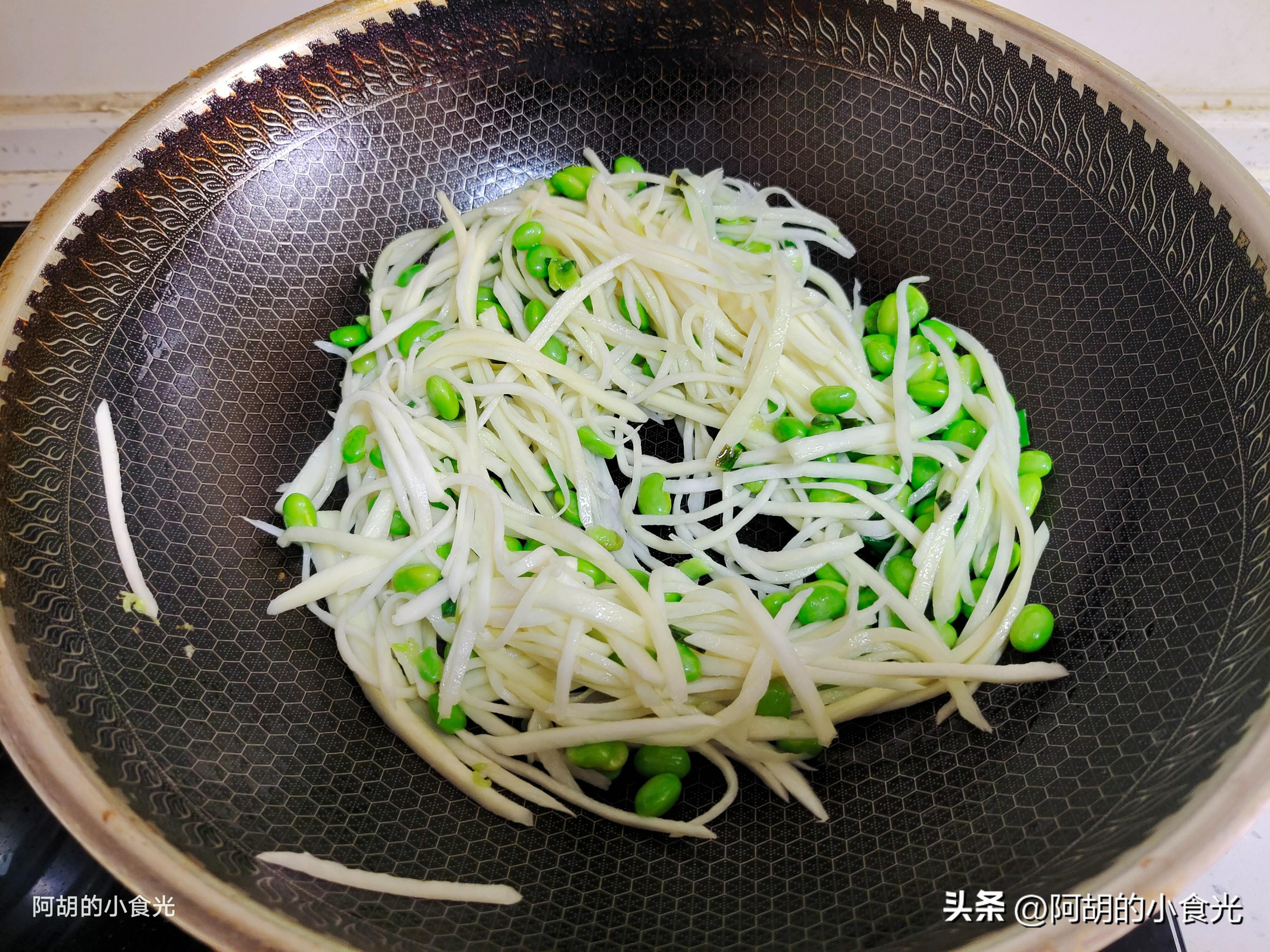第五步:另起鍋燒油,油熱後加入蔥花炒出香味,接着將鮮毛豆仁和焯水後的茭白絲一塊下入鍋中炒一炒,炒去一些水分激發出食材的鮮香味,記住要轉爲大火來翻炒。