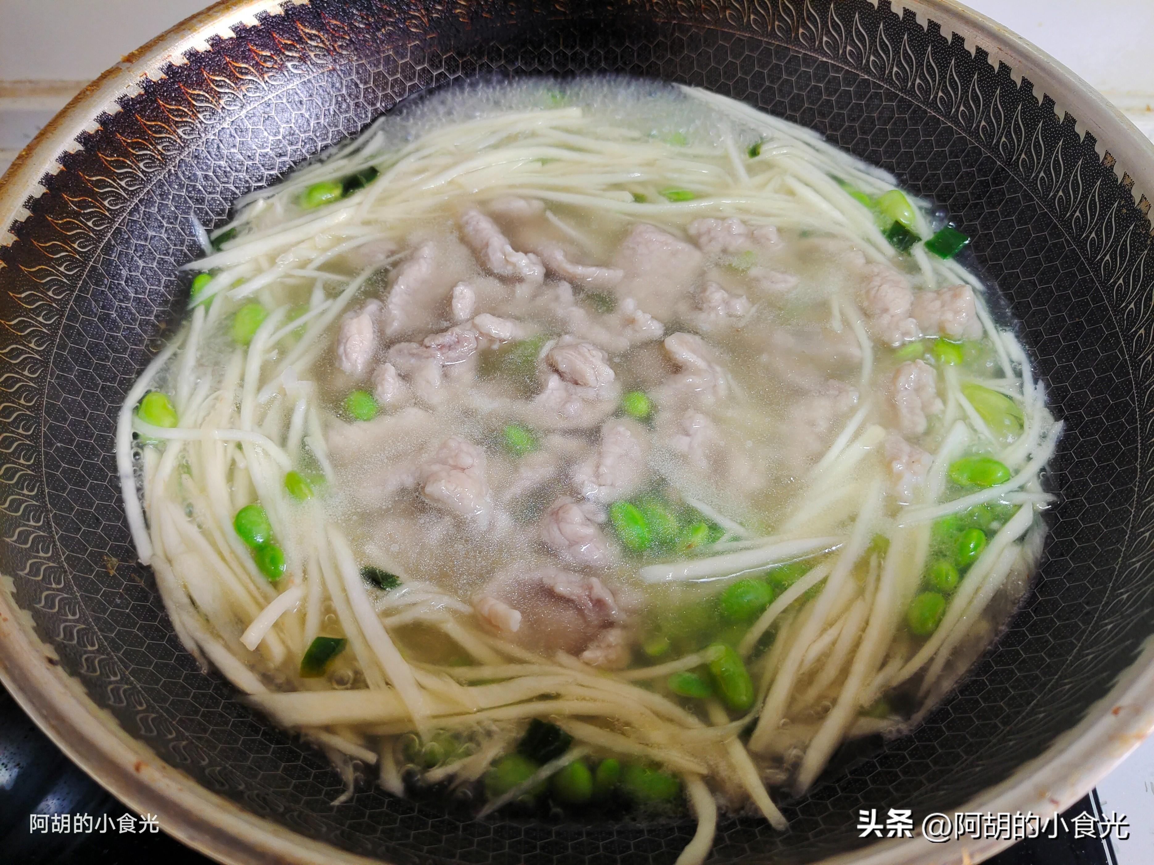 第六步:炒好後就添入適量的開水,水量要多一些。而後保持大火煮個五分鐘左右,保證毛豆熟透。再把第四步中燙好的滑肉片下入鍋中,保持大火加入一些食鹽、松茸鮮和胡椒粉調味再煮個一分鐘時間。