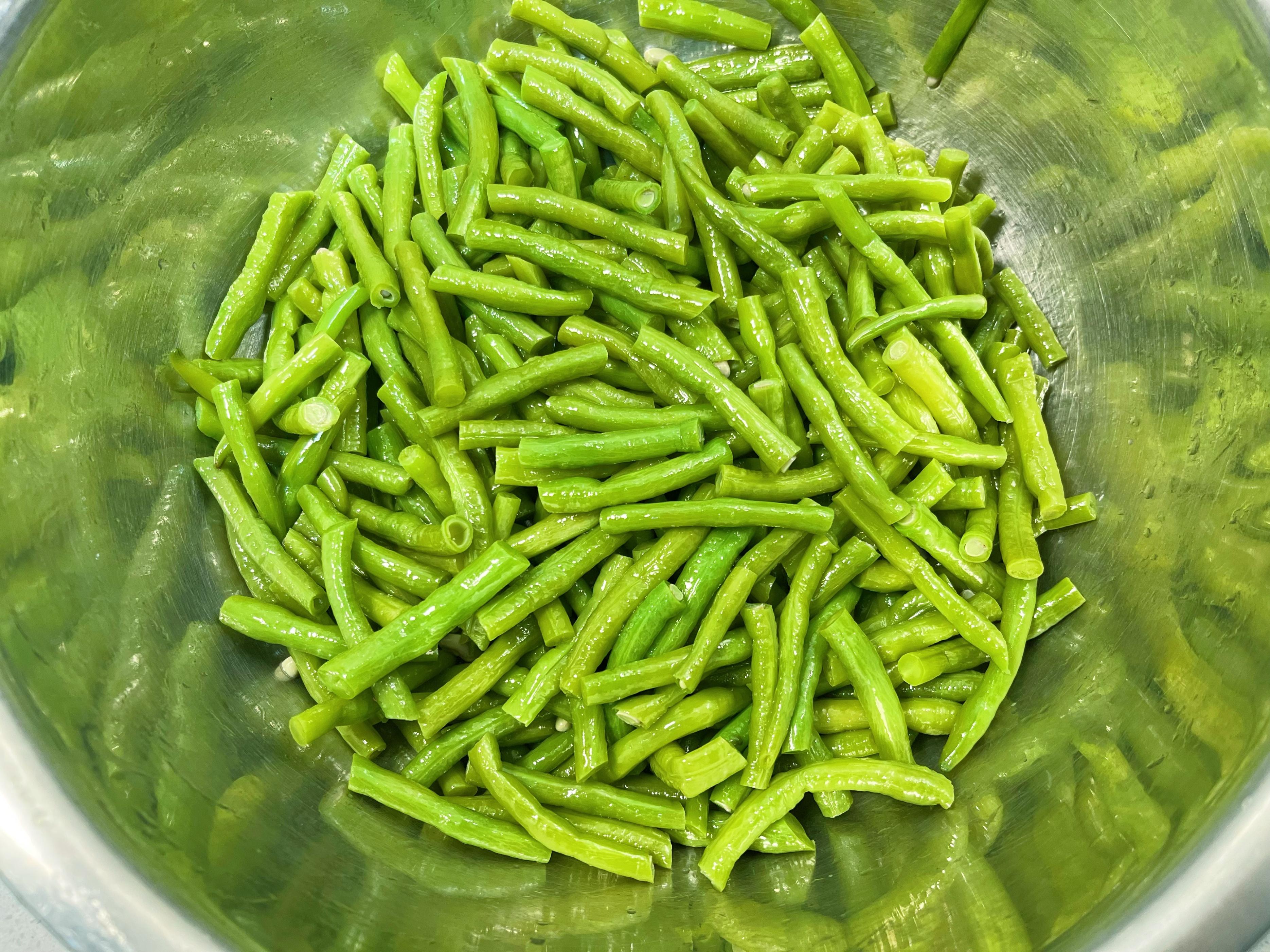 焯好的豆角馬上投入準備好的冰水或大量流動的冷水中!這一步叫“過冷河”,是保持豆角爽脆口感的靈魂所在。冷水能讓豆角溫度瞬間下降,停止內部的熱反應,口感定個在最佳狀態。讓豆角在冷水裏徹底涼透,摸上去沒有一絲溫熱感。