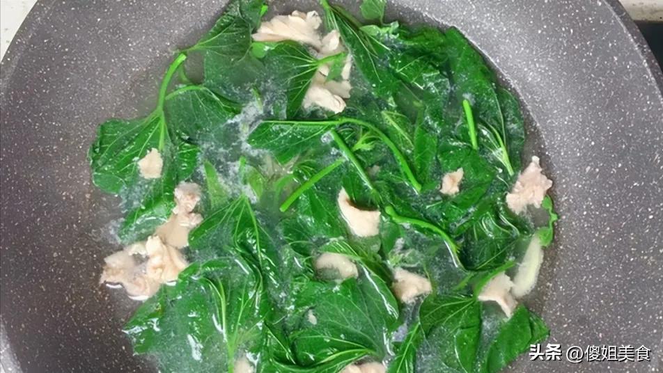 3、肉片基本變色後(也就幾十秒),立刻把紅薯葉全部倒進去!紅薯葉燙軟後(翠綠變深綠即可,千萬別煮黃了!),趕緊調入鹽、一點點白胡椒粉。喜歡更鮮一點的,可以加一丁點雞精或蠔油(不加也行,紅薯葉本身很鮮)。十三香粉這時可以撒一丟丟進去(不喜歡的可以省略)