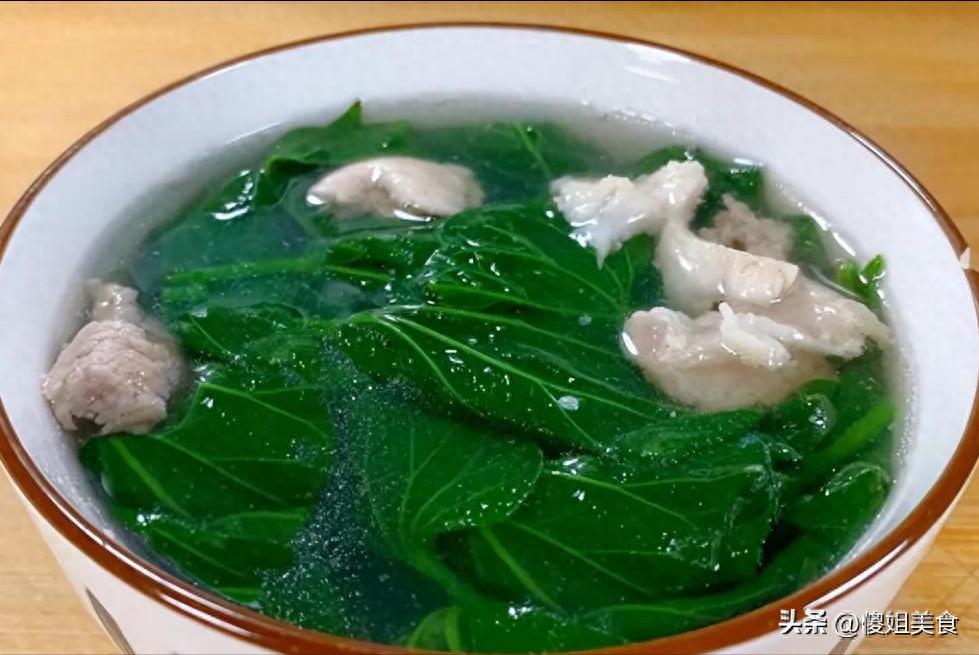 【紅薯葉肉片湯】 所需食材:紅薯葉、瘦肉、十三香、料酒、生粉、雞精、蠔油、鮮姜、鹽、胡椒粉