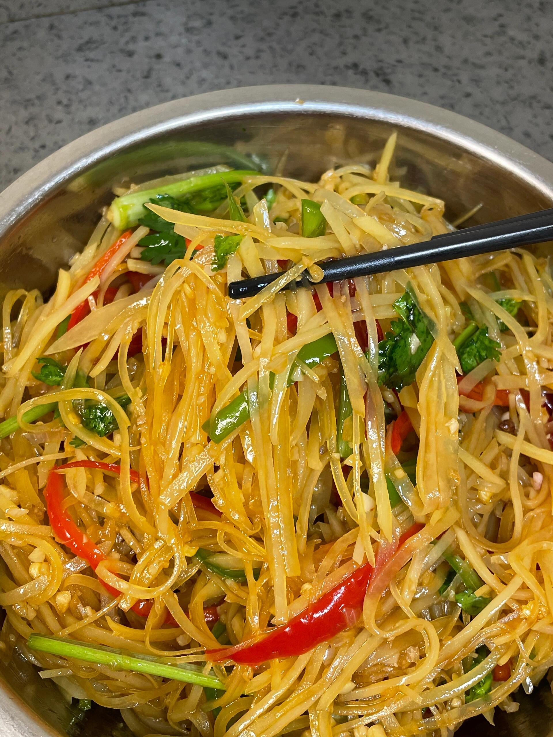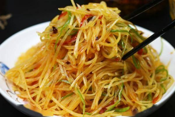 做法:1土豆清洗, 去皮,切絲,放進鍋裏用熱水煮一下,煮沸後,撈起,過涼水,瀝乾水分