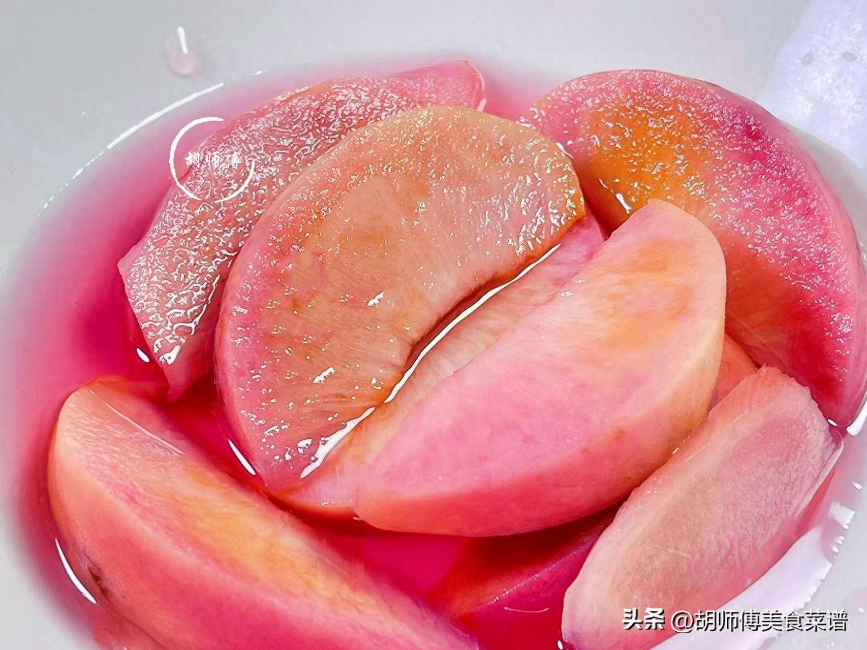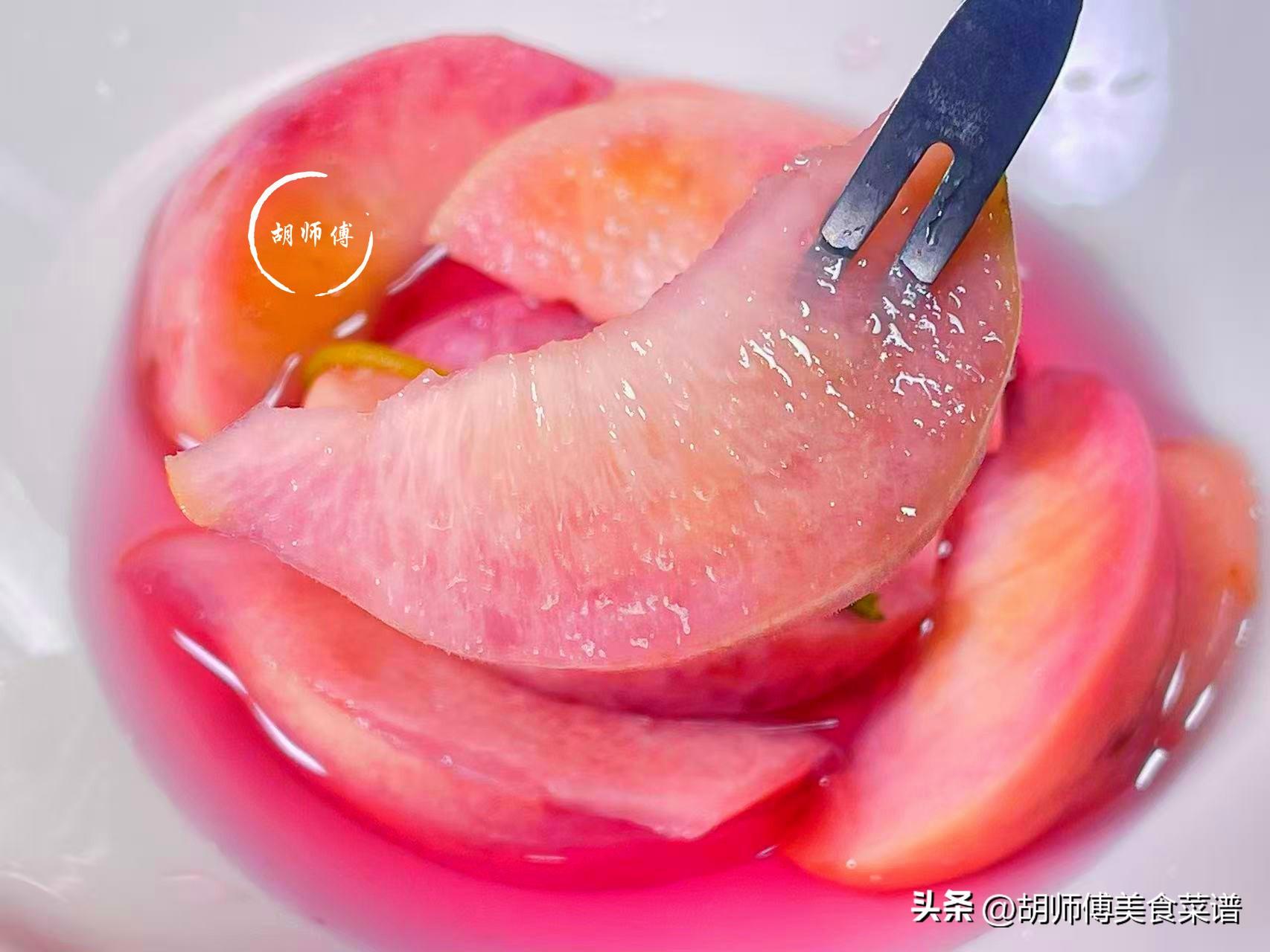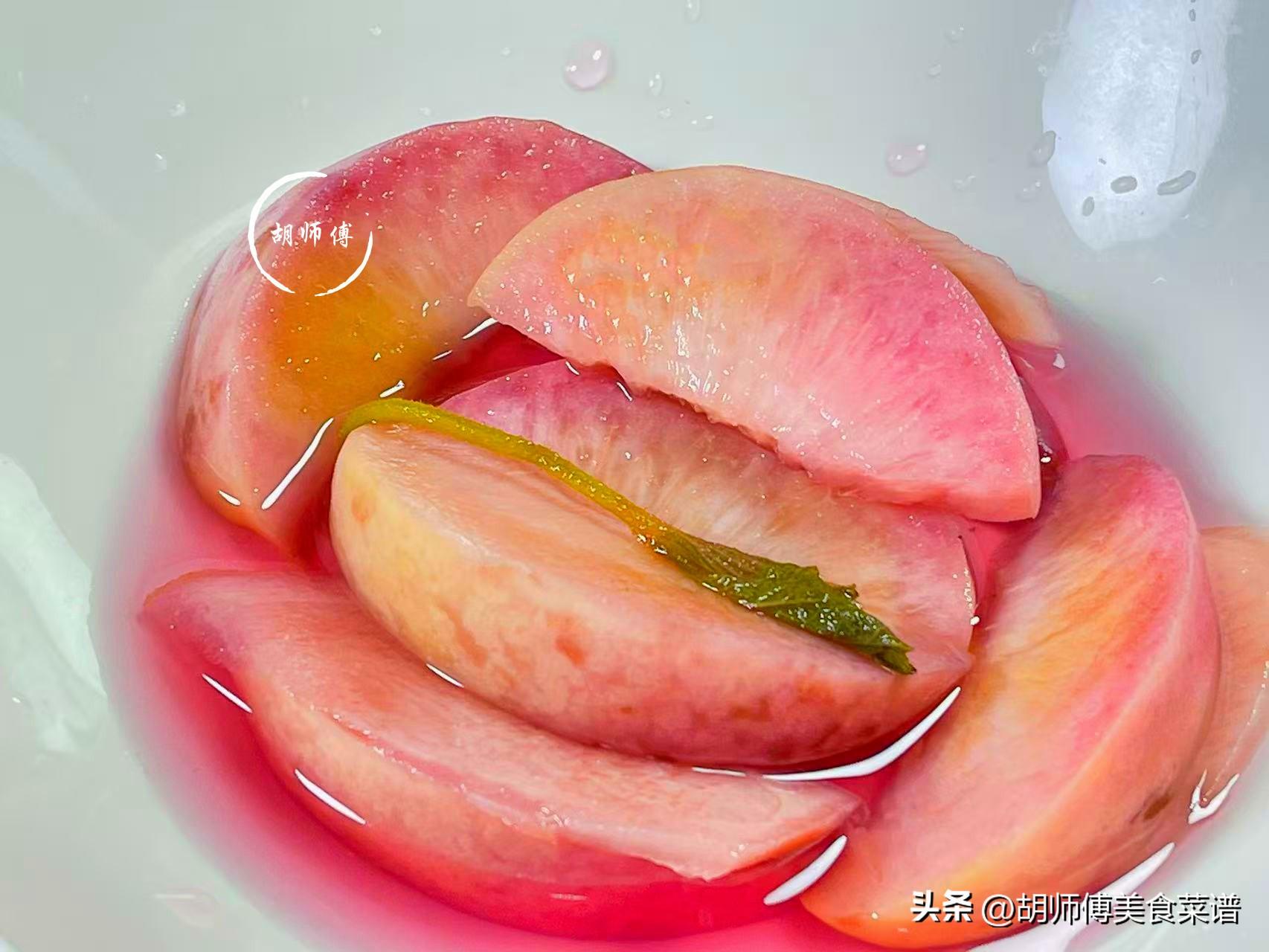 1、大家買桃子時,一定要當天買當天做,因爲有些脆桃買回家放1-2天,會產生乙烯,導致桃子變軟,而軟桃子泡着喫,口感一點都不好呢!