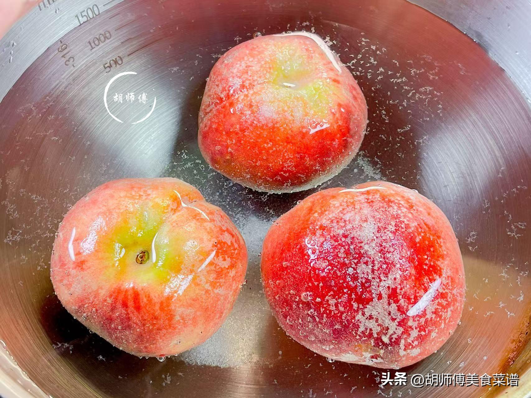 第一步:買回家的桃子,先將桃子和一勺食鹽放入盆中浸泡3分鐘,時間到後,用手反覆搓桃子,將桃子表面的毛搓掉後,再用自來水將桃子沖洗乾淨。桃子表面的買一定要完全搓掉,如果不搓掉,喫了到毛的桃子很容易腹瀉。