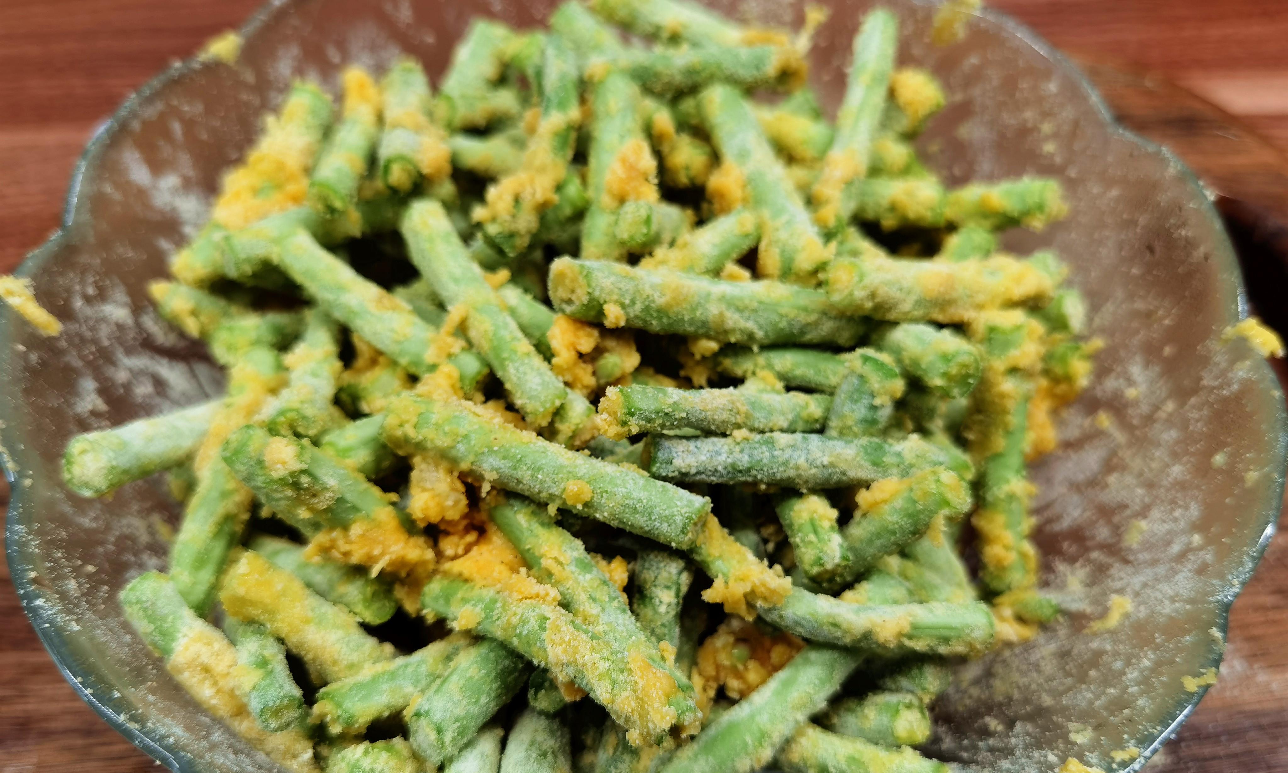 2. “粉墨登場”裹均勻:處理好的豆角段放入稍大的盆裏。先淋入那一小勺食用油,打入2個雞蛋,用手抓拌均勻。油膜能有效防止後續粉類結塊粘連。接着,把細玉米麪、普通麪粉和鹽混合好,像天女散花般均勻地撒在豆角上。下手!不是用筷子,是用你的雙手,像給豆角做“按摩”一樣,輕輕翻拌、抓勻,務必讓每一根豆角都均勻地、薄薄地裹上一層黃白相間的粉衣。狀態應該是乾爽鬆散的,沒有明顯溼麪糰或大塊結團。粉的量不是死的,豆角表面溼潤就稍微多加一點點粉。