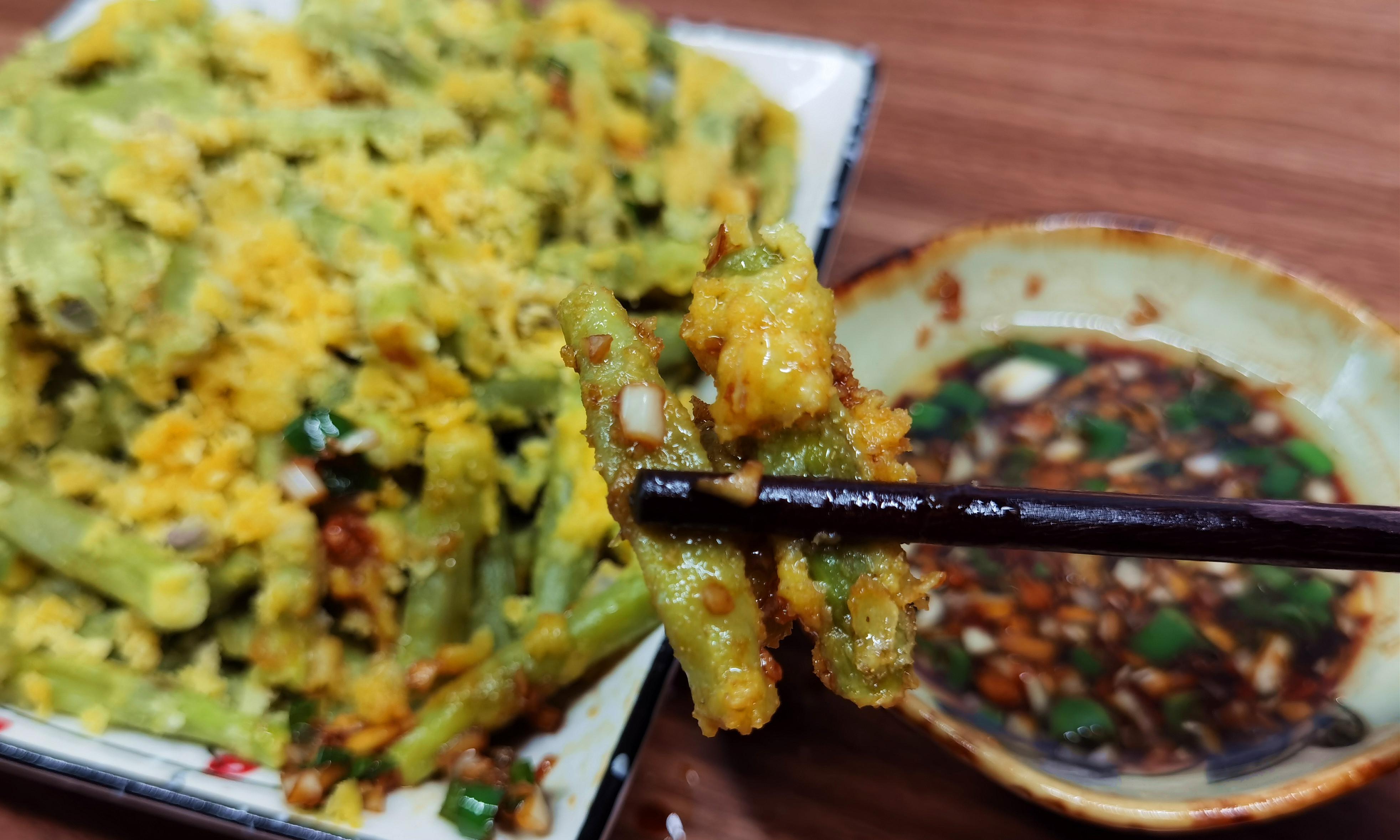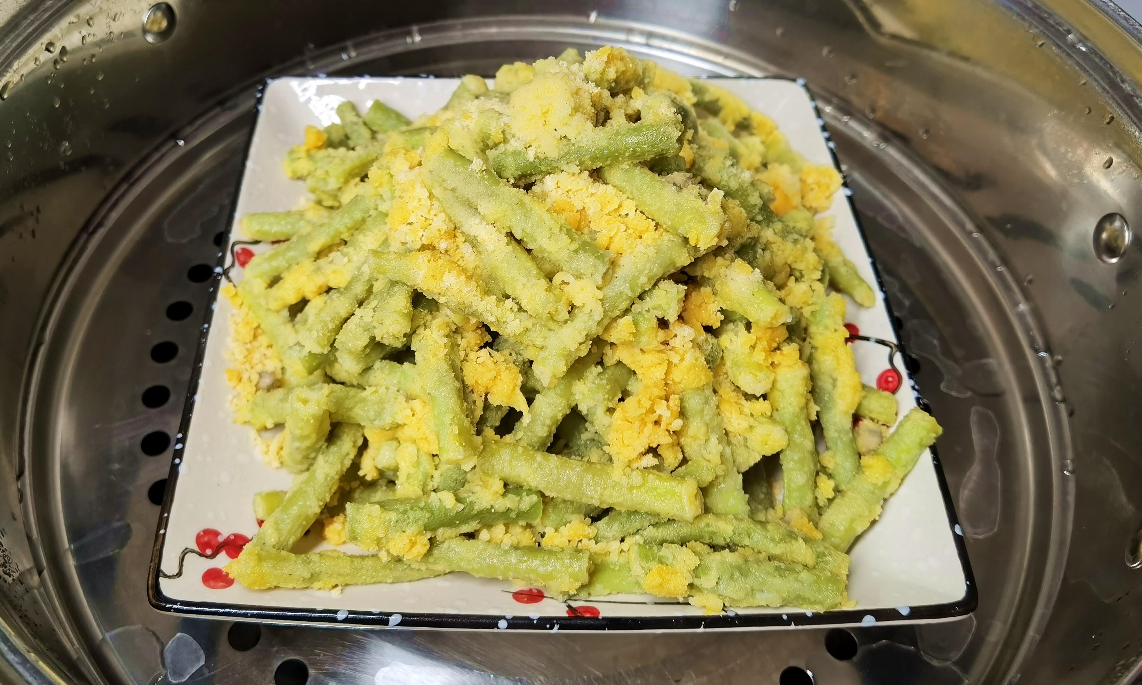 當蒸鍋揭開、熱氣升騰的那一瞬,碧綠綴着金黃的豆角安靜地躺在籠屜上,廚房裏瀰漫着穀物與豆角交融的質樸甜香。取一筷頭蘸滿蒜醋汁送入口中,蒸騰的熱氣與酸辣的汁水在舌尖碰撞出奇妙火花——那是汗水蒸騰的苦夏裏,樸素食材用最溫柔的方式給予身體的慰藉與力量。芹菜韭菜靠邊站?不,是豆角蒸出了獨屬夏日的清涼一隅。
