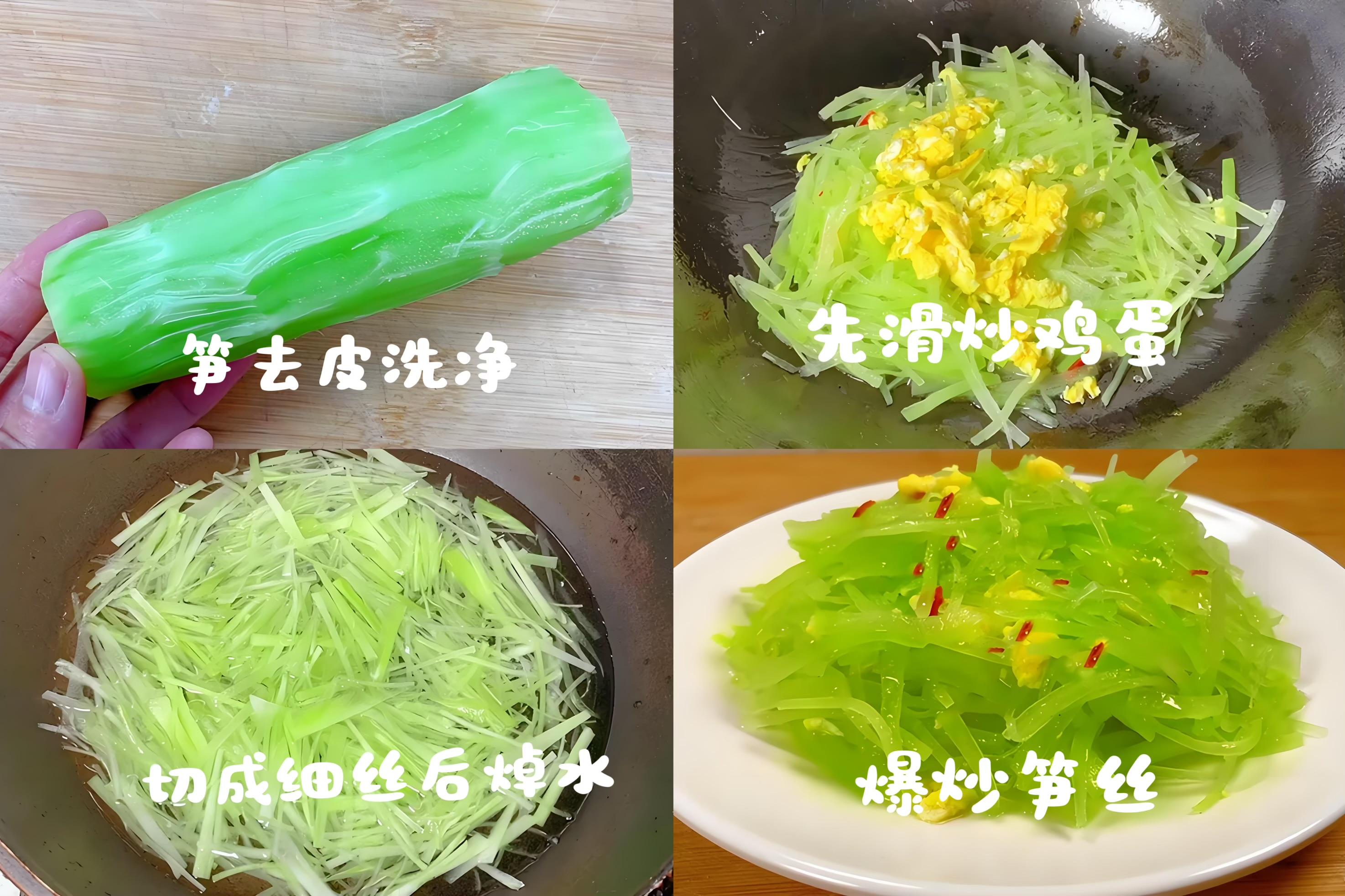 3、鍋裏留底油(不夠可再加點),燒熱後下入筍絲,中大火快速翻炒約1分鐘至斷生。倒入之前炒好的嫩雞蛋塊。