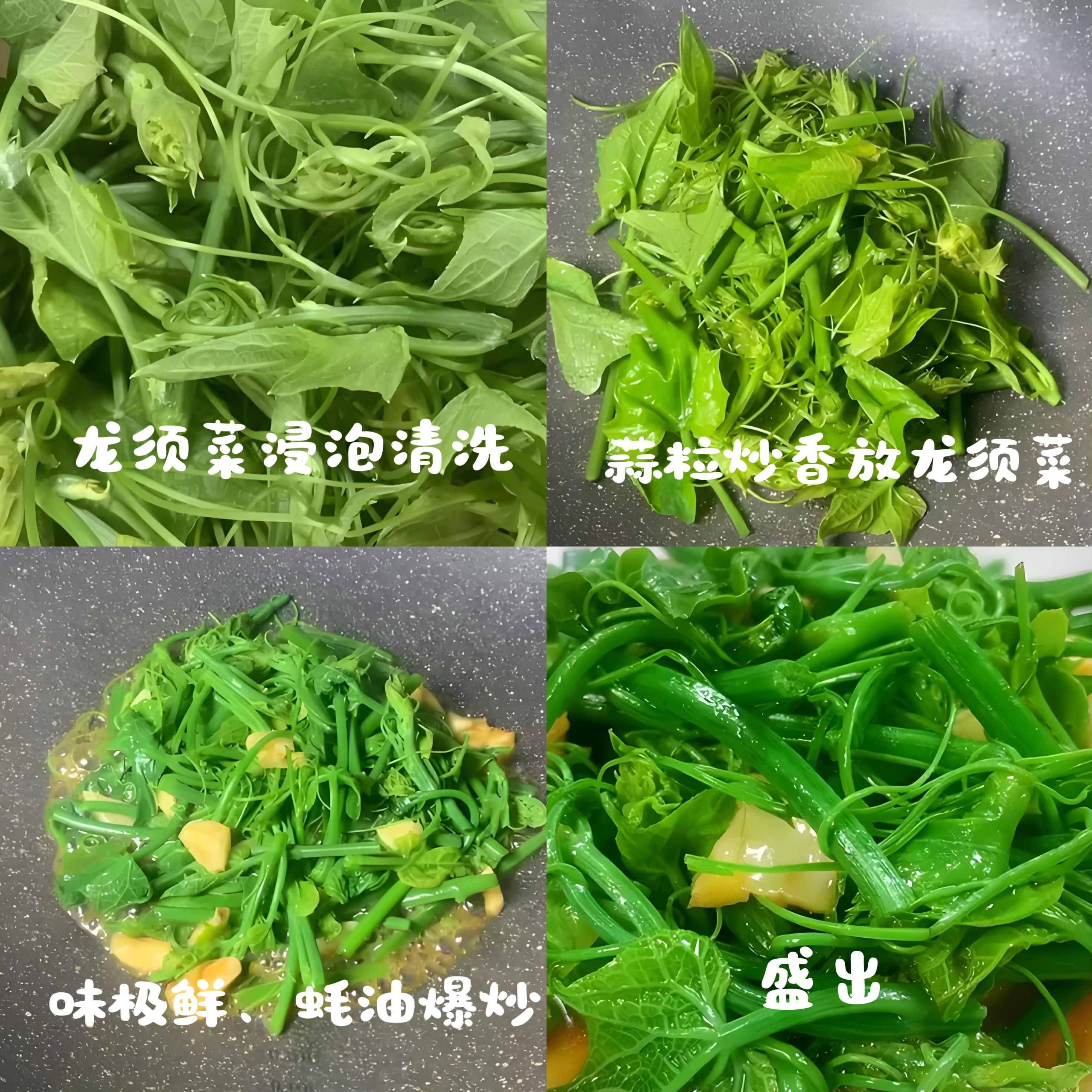 1、買來的龍鬚菜通常帶着嫩梢和須,非常鮮嫩。只需摘去可能殘留的少量老梗或黃葉,用清水輕柔漂洗幾遍,瀝乾水分。切記: 千萬別使勁搓揉,它嬌嫩着呢!