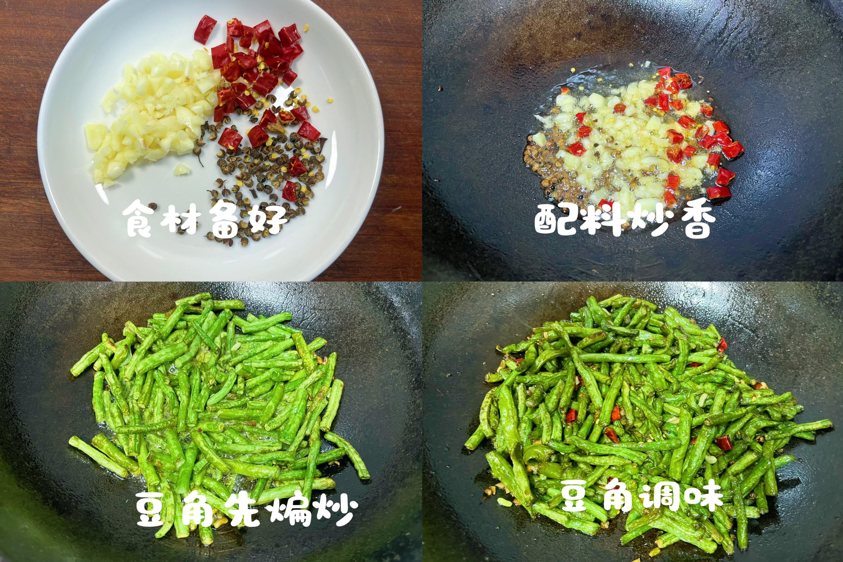 1、豆角洗淨掰成長段,瀝乾水分(關鍵!)。