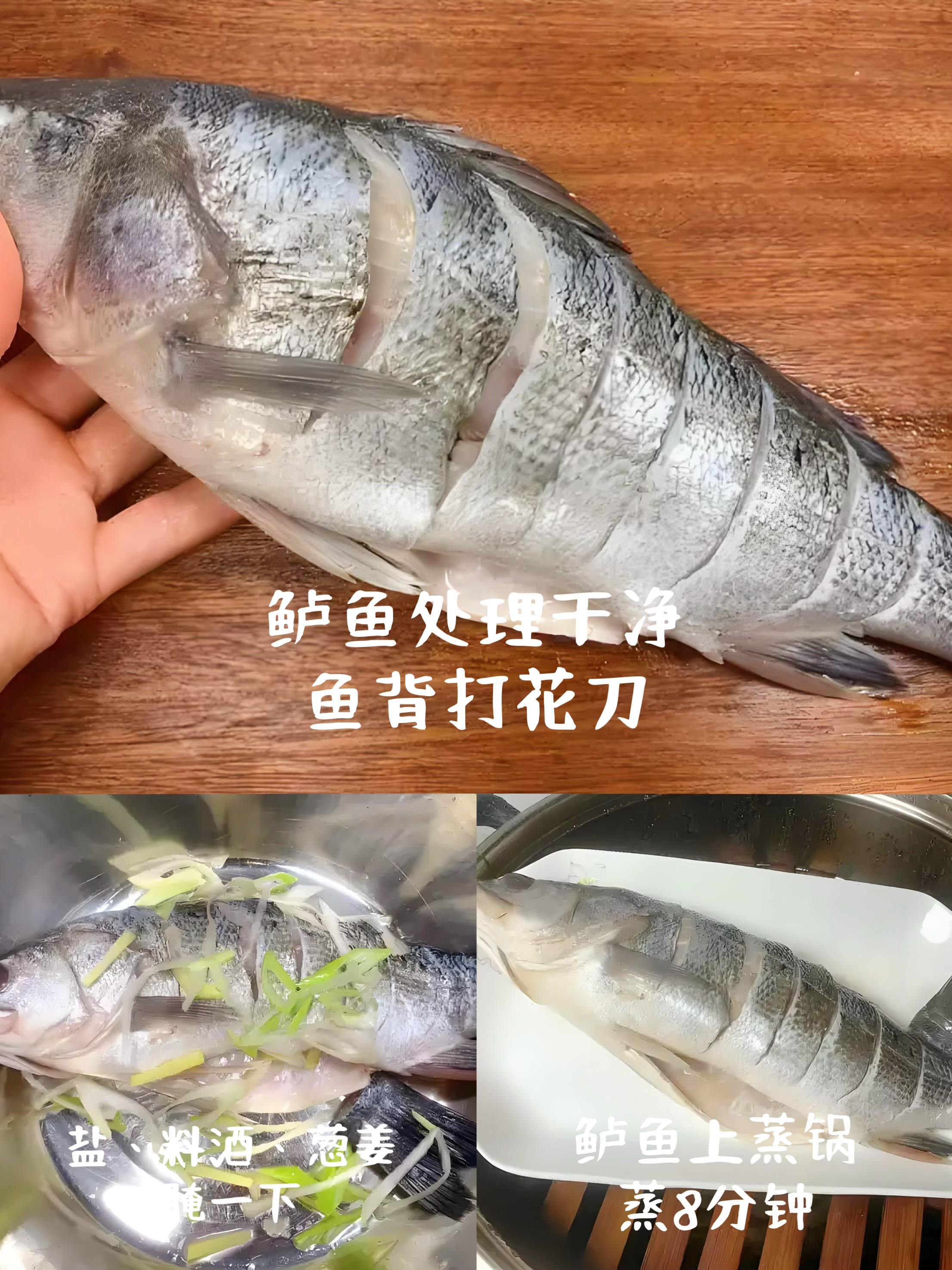 4、蒸熟取出,倒掉盤中腥水,抽掉魚肚裏的蔥姜。在魚身上鋪好新鮮蔥絲、薑絲。