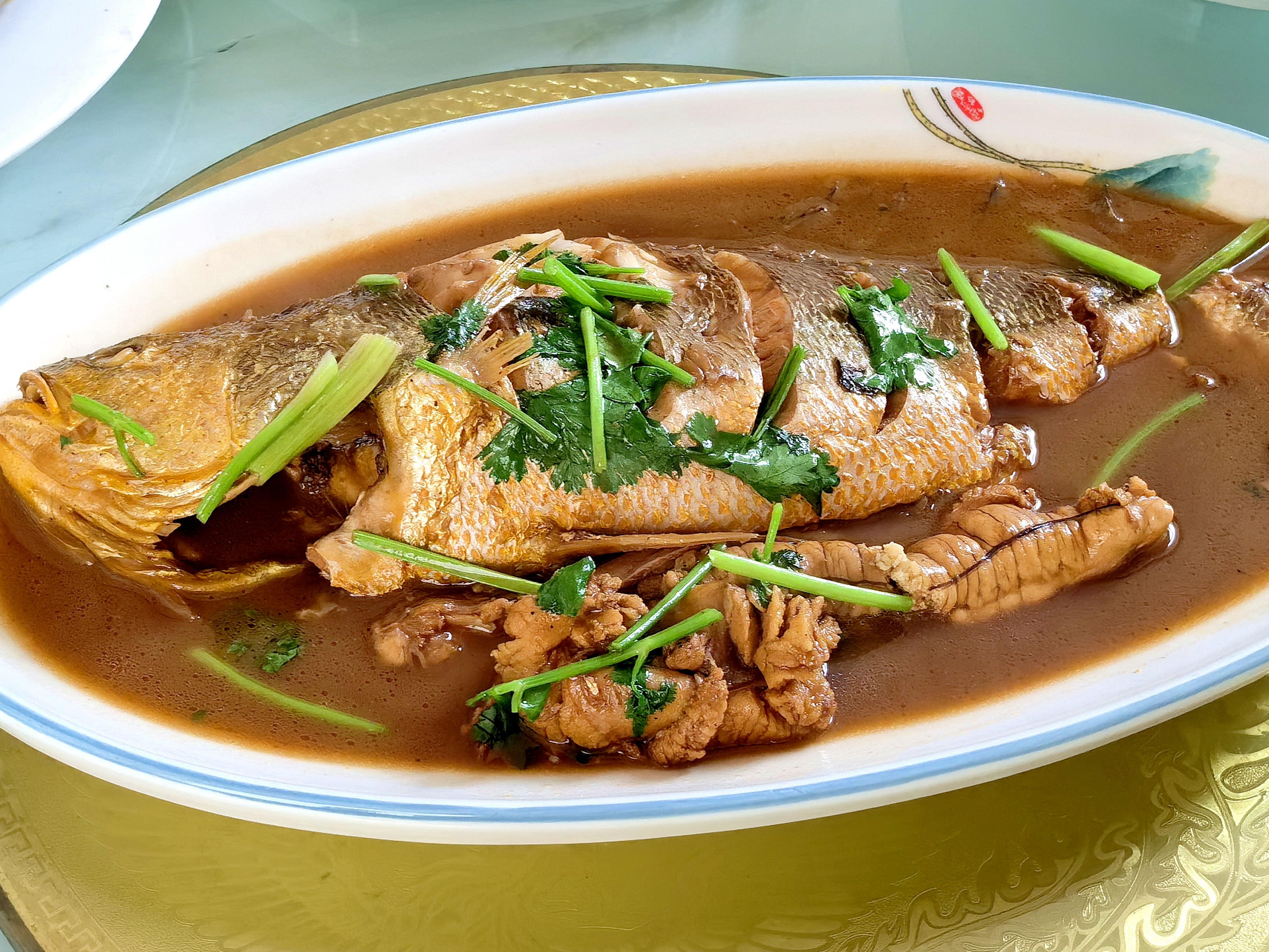 4、小心放入黃花魚,水量大約到魚身一半。大火燒開後轉中小火,蓋上蓋子燜10-15分鐘。